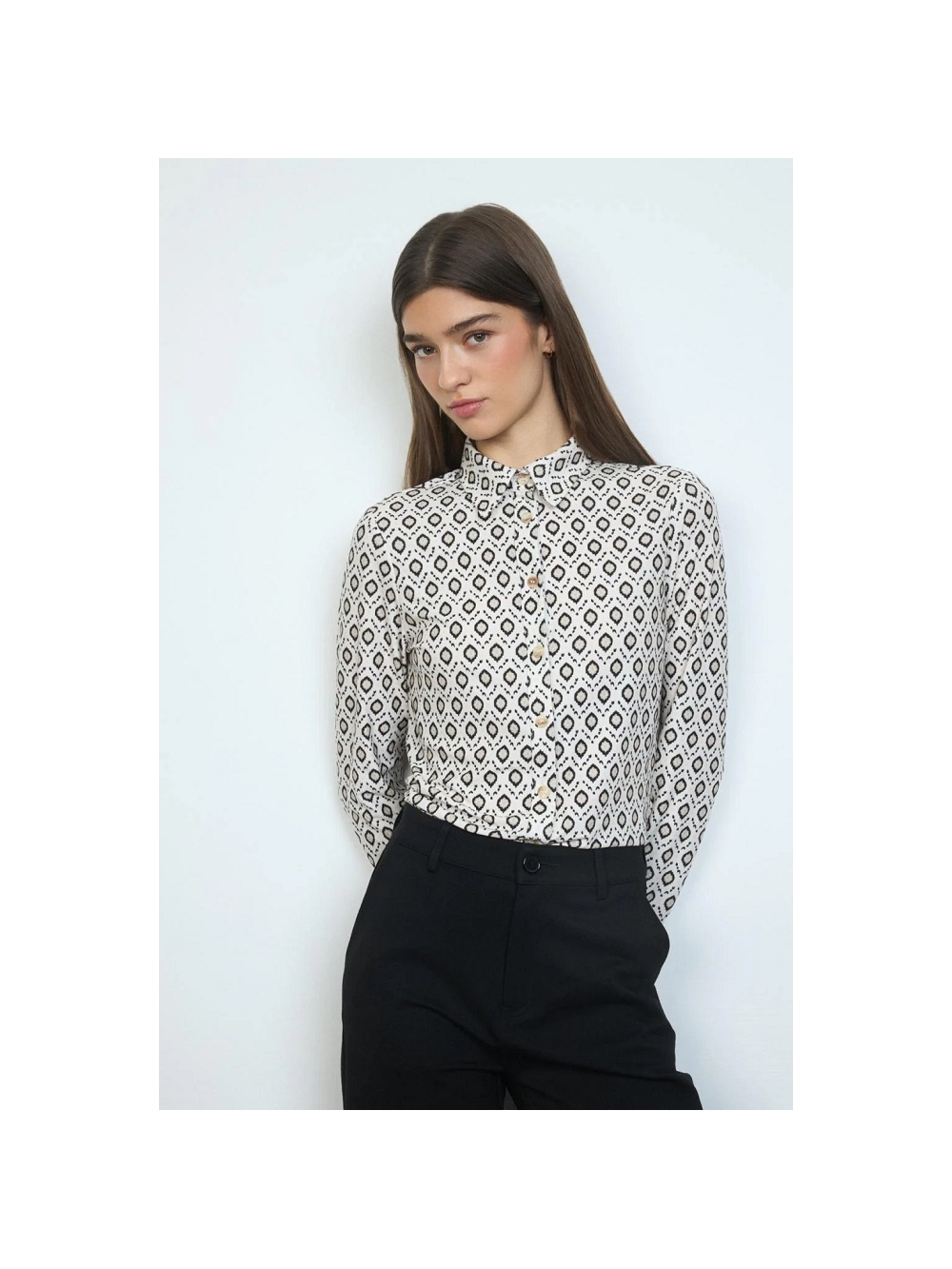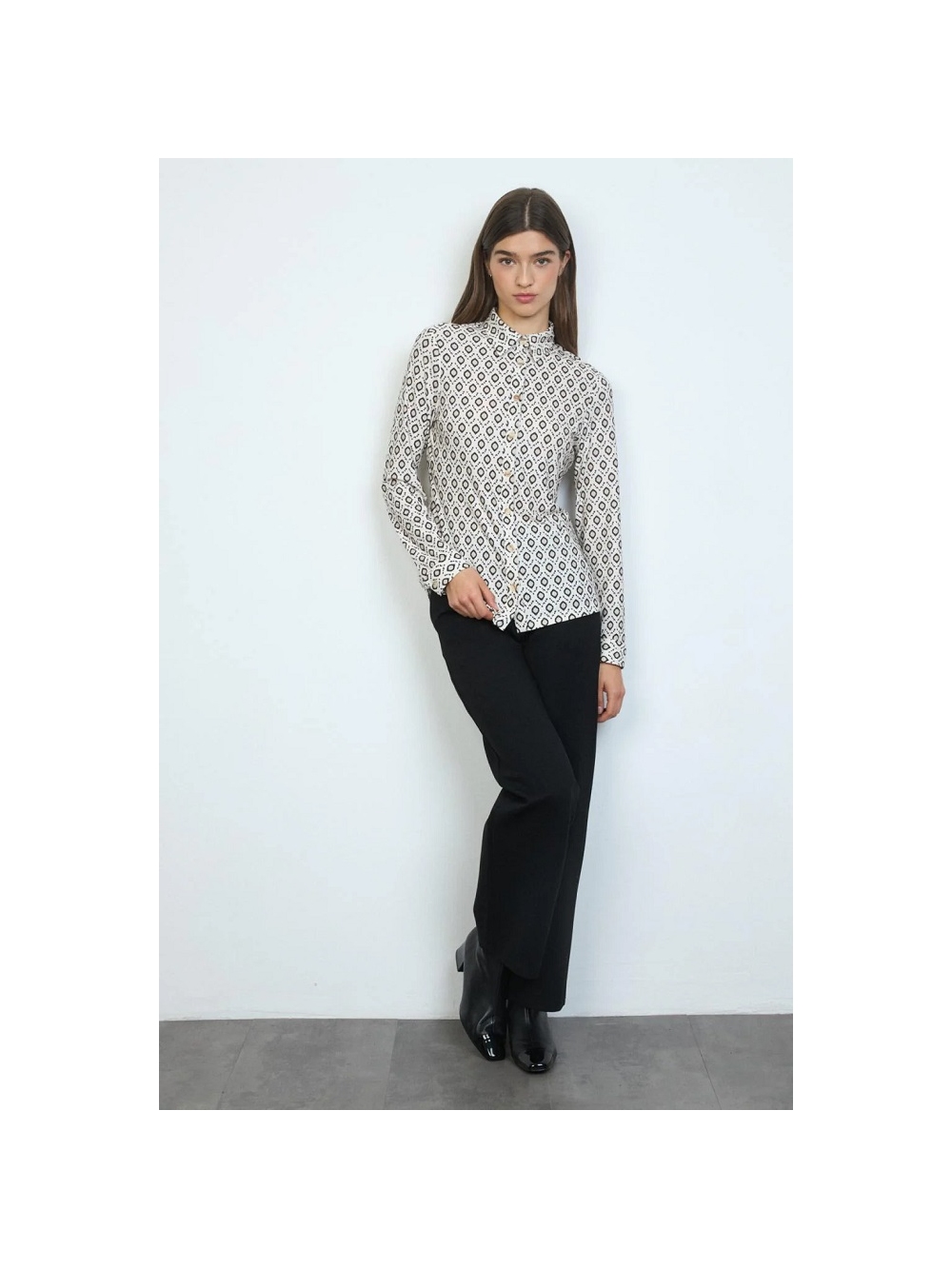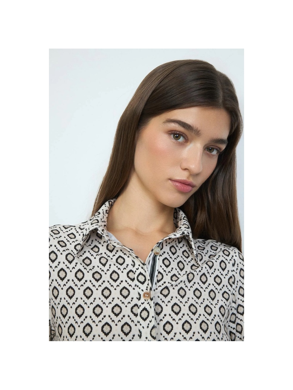 Camisa con estampado geométrico. Diseño recto con tejido de punto elástico. Cuello camisero alto. Cierre con botones. Manga larga acabada en puño con botón. Bajo recto. Diseñada y fabricada en España. COMPOSICIÓN: 95º/ₒ POLIESTER 5º/ₒ ELASTANO