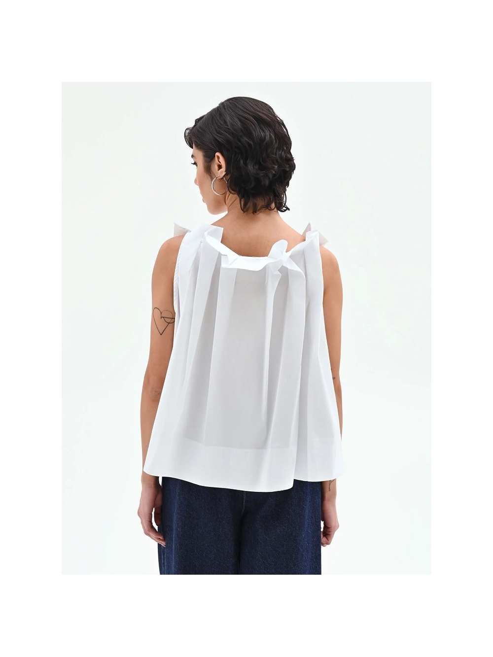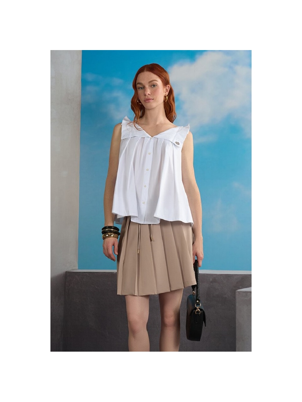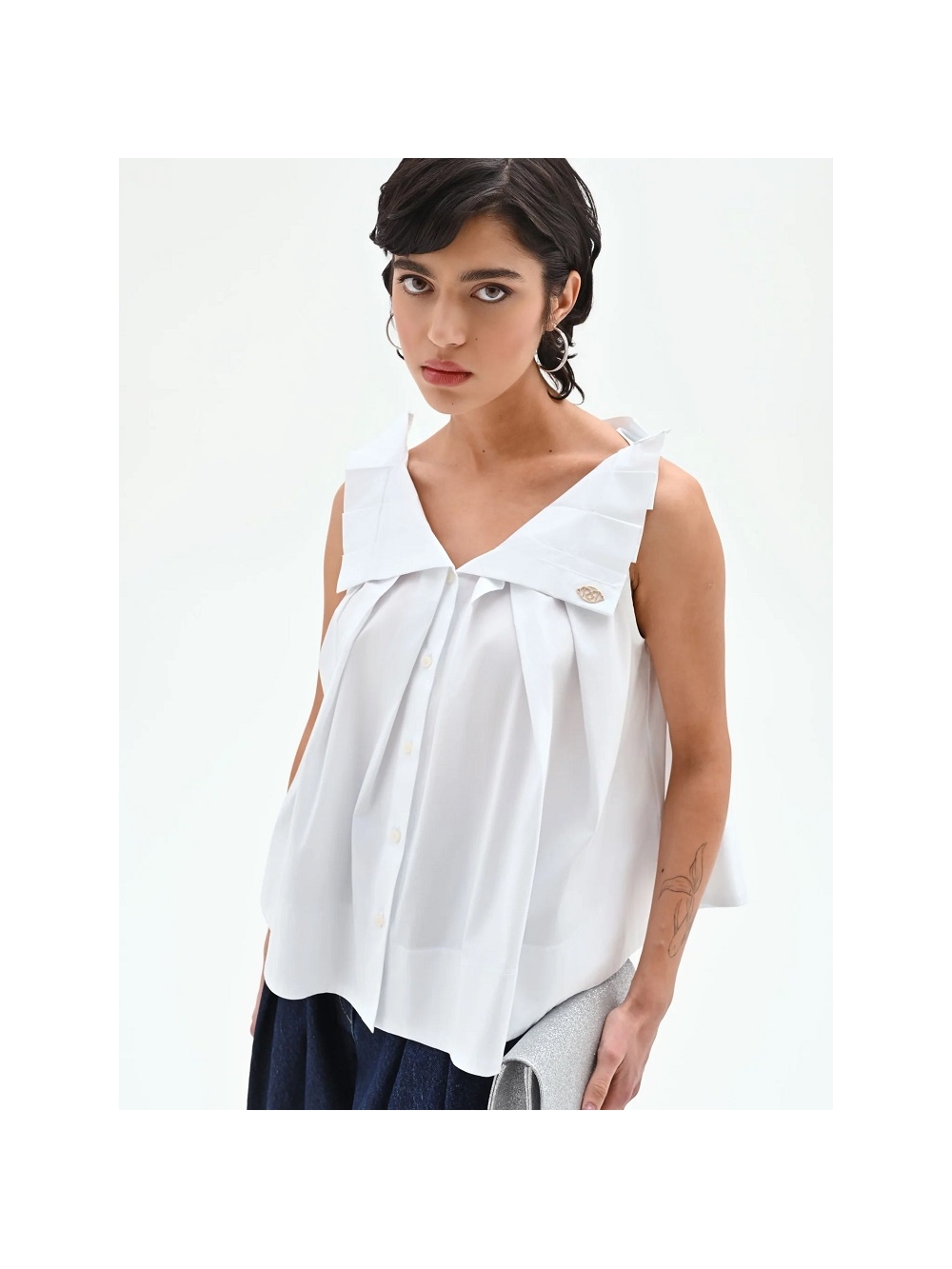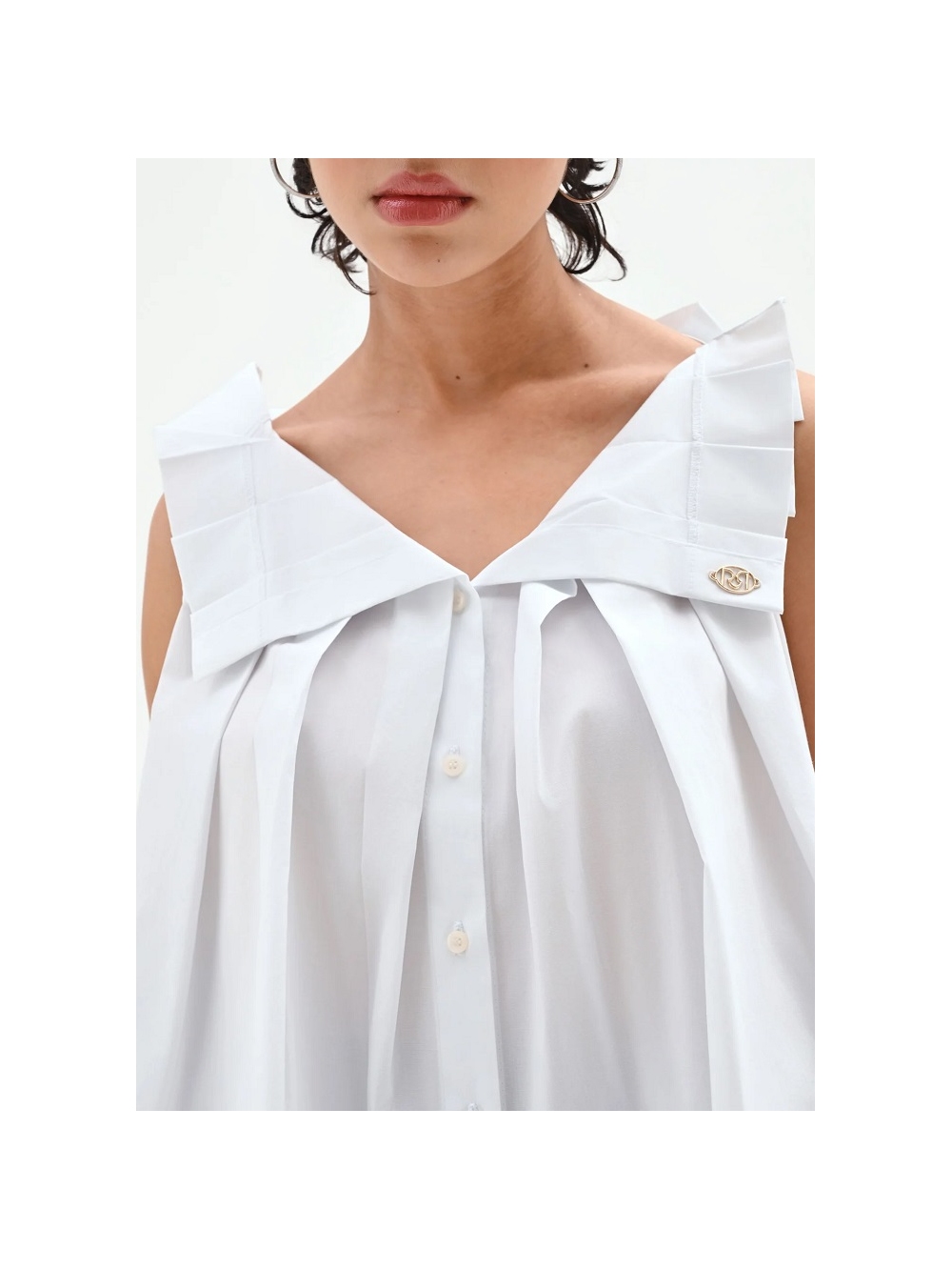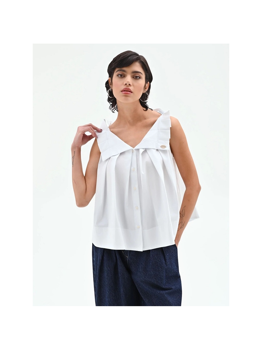 Un equilibrio entre frescura y volúmenes esculturales define esta prenda. diseñada para quienes buscan una elegancia desenfadada para el día a día. Confeccionada en popelina de algodón crujiente. esta blusa atrae todas las miradas con los amplios volantes de tejido que definen los hombros. aportando tridimensionalidad y carácter a la silueta. El escote en V presenta un cierre frontal parcial con delicados botones a tono. mientras que el corte imperio bajo el pecho da paso a una silueta evasé. con pliegues que le aportan un aire etéreo y movimiento. El diseño se enriquece con una placa metálica dorada. aplicada cuidadosamente sobre un detalle de solapa en el lateral. La prenda está fabricada en Italia. La modelo mide 1.73 m y lleva la talla S. COMPOSICIÓN: