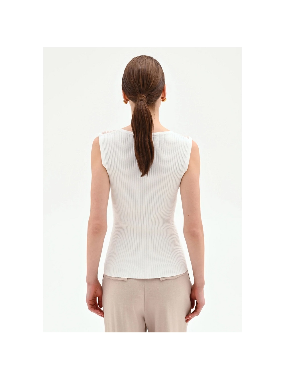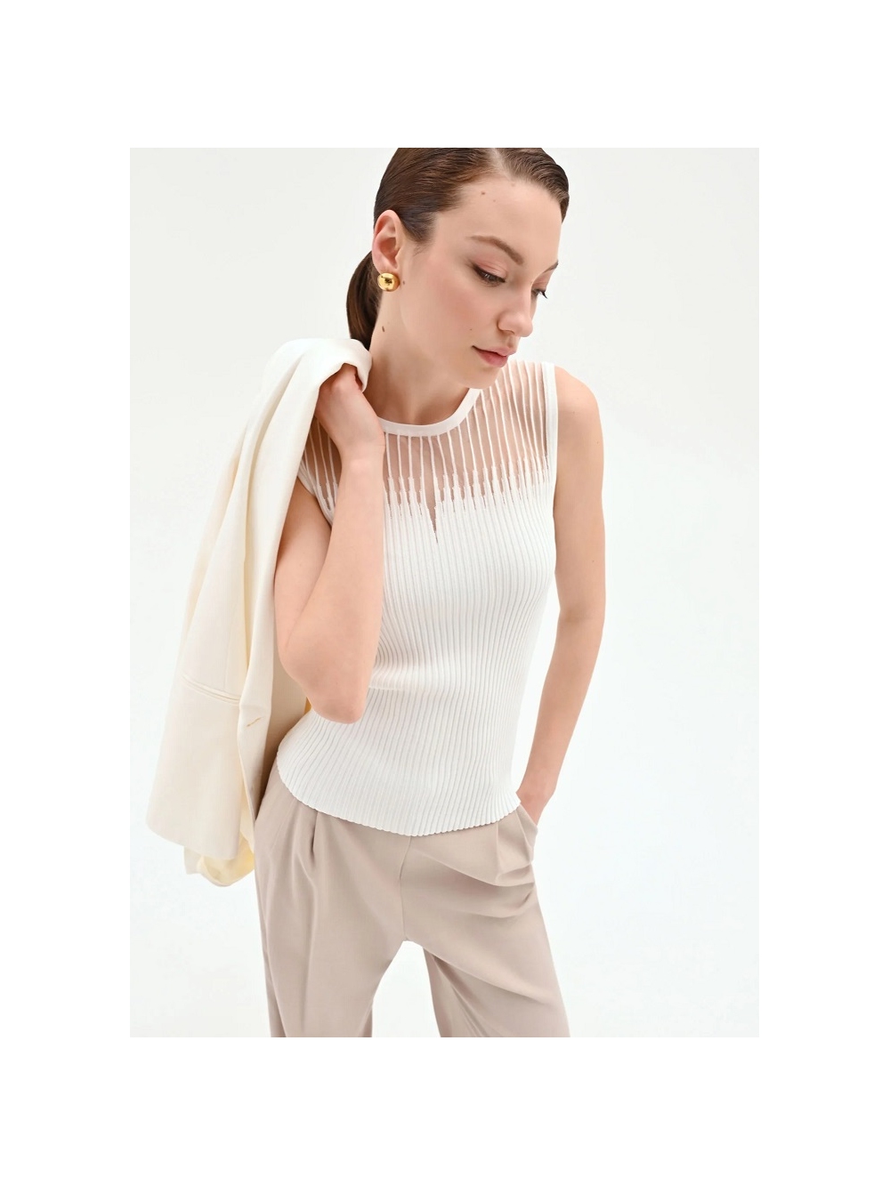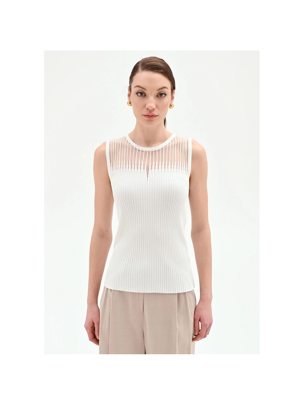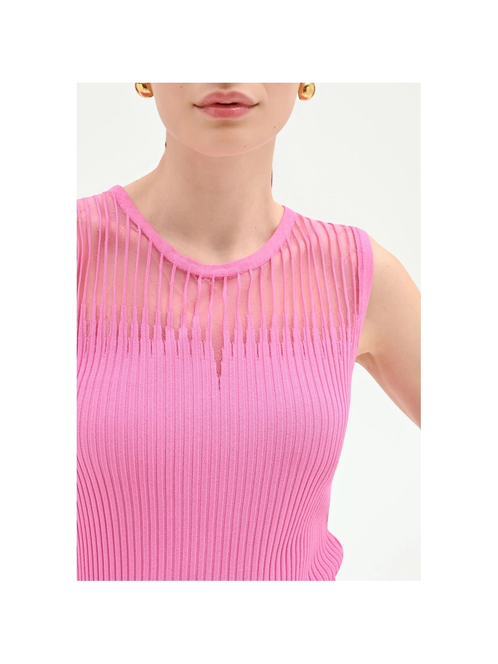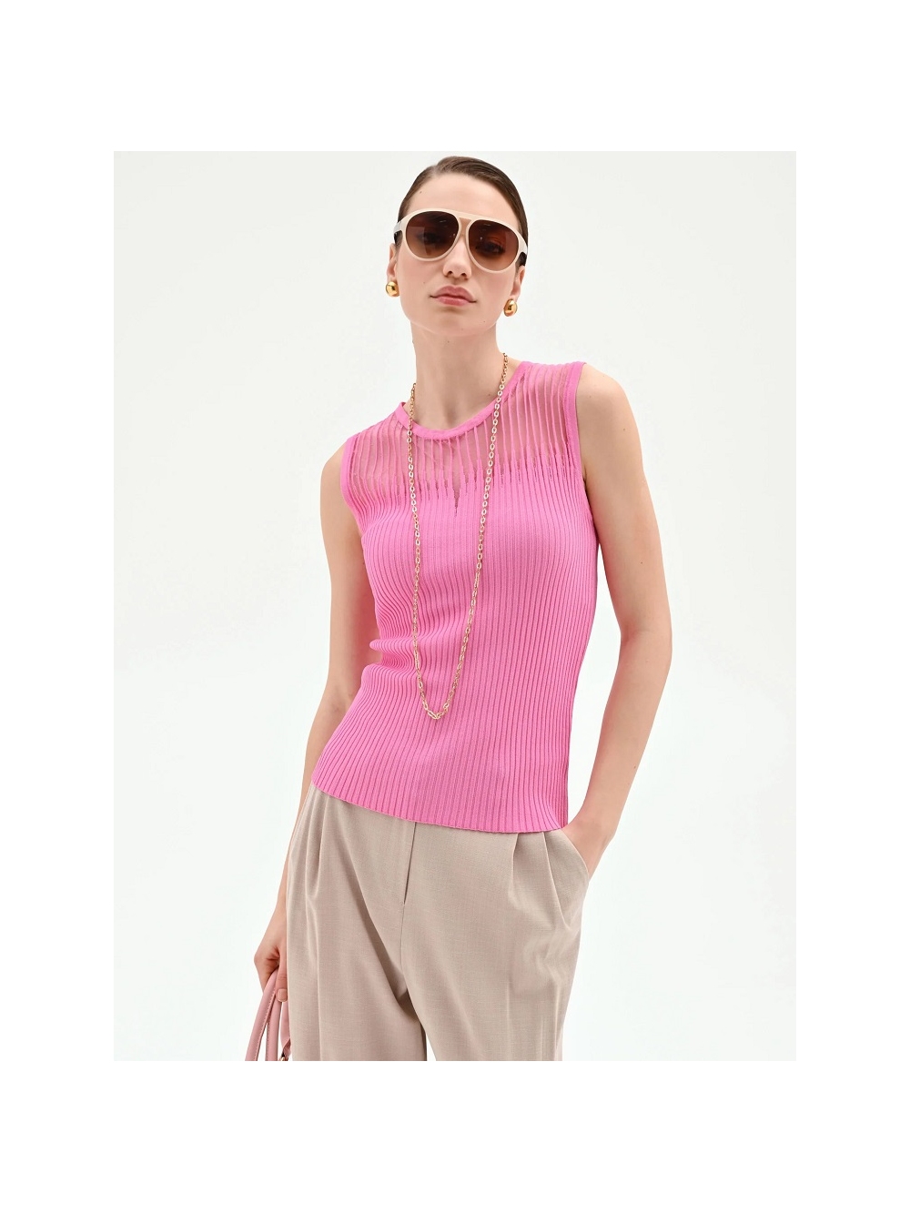 Un equilibrio perfecto entre la comodidad del día a día y los detalles sofisticados. el top de punto de canalé es la prenda clave para añadir un toque de color y feminidad al armario de temporada. Su versatilidad lo convierte en un valioso aliado para crear looks siempre nuevos y personales. del día a la noche. Confeccionado en una suave viscosa de punto de canalé. presenta un corte ajustado que realza la silueta con naturalidad y sin oprimir. El diseño se enriquece con una inserción semitransparente en el canesú delantero. definida por un tejido de rayas verticales que crea un delicado juego de texturas. Bajo la inserción. una pequeña abertura en forma de lágrima añade un toque de gracia al modelo y rompe con elegancia la línea del cuello redondo. Este top sin mangas es muy fácil de llevar gracias a su diseño esencial. La modelo mide 1.77 m y lleva la talla S. COMPOSICIÓN: