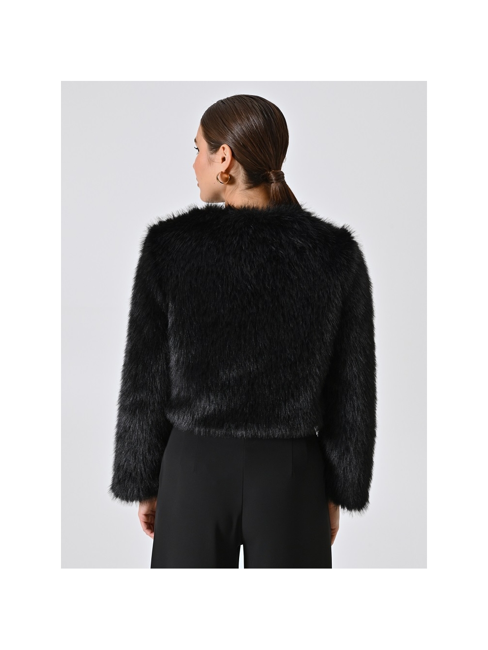 Esta chaqueta corta es una propuesta cálida y refinada, idónea para potenciar el estilo de tus conjuntos formales y de ocasión especial. Su confección en suave tejido efecto pelo presenta una línea boxy que acaricia la silueta sin ceñirla. La estructura corta la hace ideal para llevar con vestidos y trajes elegantes, mientras que el cierre interior mantiene el diseño nítido y esencial. Podrás lucirla como una alternativa elegante al clásico bolero. Todo el proceso de confección de la prenda se ha llevado a cabo en Italia. La modelo mide 1,77 m y lleva una talla S. COMPOSICIÓN: 100% POLIESTER