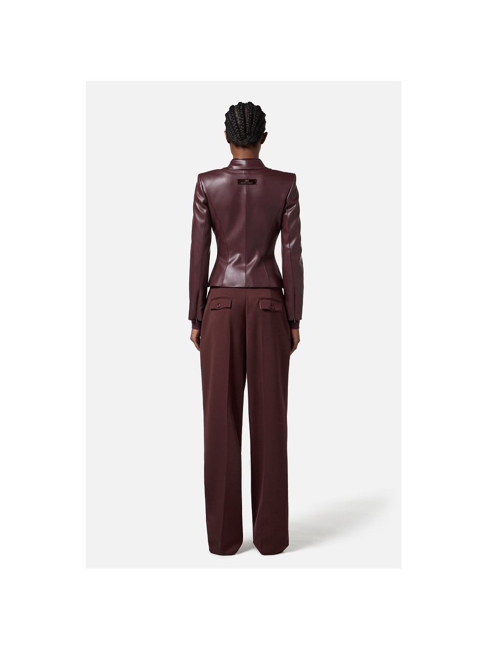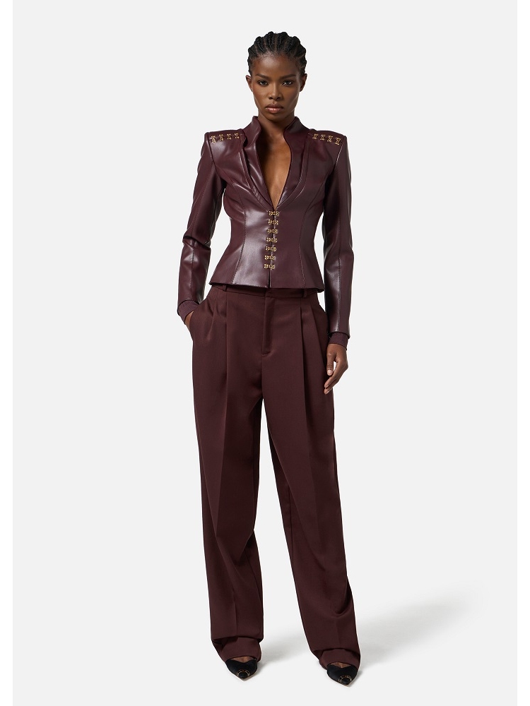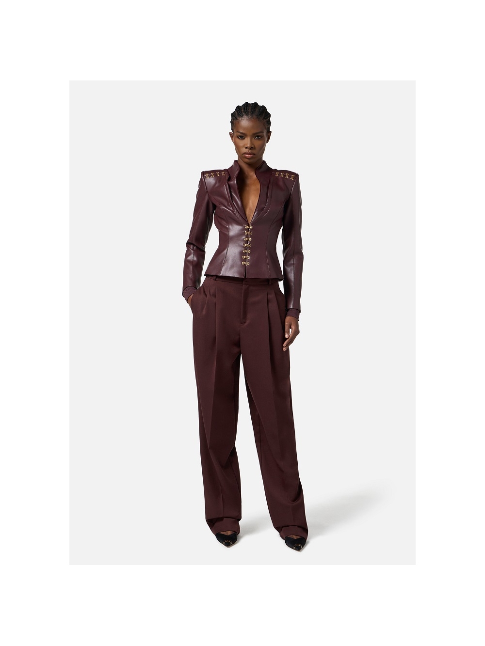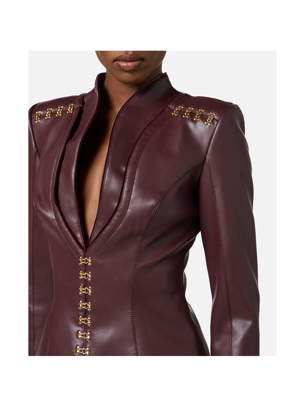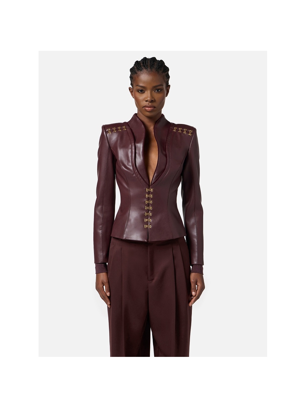 Chaqueta hecha de material sintético efecto napa. Presenta hombros estructurados y solapa perfilada que crea efectos distintivos de ribete, resaltados con detalles de cordoncillo y la confección de corsé que estiliza la figura. Los ganchos de metal dorado iluminan hombros y busto. Talla slim. Hombreras acolchadas. Forro de raso. Ganchos de metal dorado. Cierre con ganchos.