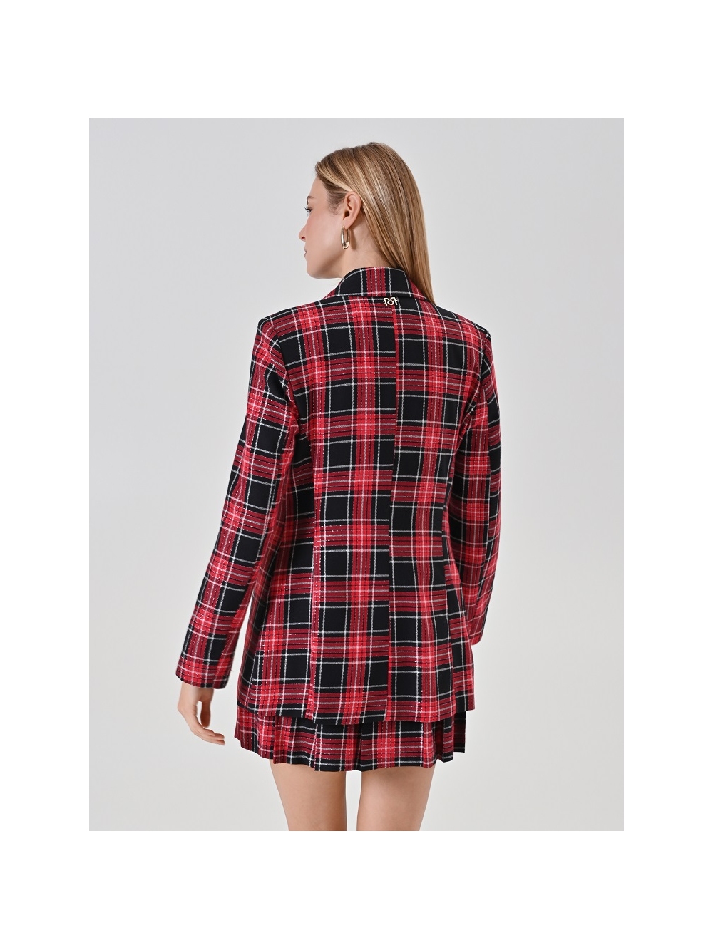 El encanto atemporal del tartán se ilumina con notas contemporáneas en esta chaqueta roja, una prenda diseñada para quienes adoran distinguirse con estilo y carácter en el día a día. Confeccionada en un tejido de cuadros con discretos hilos de lúrex que añaden un punto de luz al estampado, la chaqueta presenta un diseño de sastrería de corte recto. Su construcción cruzada se define por el cuello con solapas de pico y los hombros estructurados, detalles que confieren una elegancia rotunda a la silueta. El cierre frontal cuenta con botones oscuros en contraste, mientras que los dos bolsillos ribeteados con solapa completan el modelo con un toque funcional y sofisticado. Prenda fabricada en Italia. La modelo mide 1,76 m y lleva la talla S. COMPOSICIÓN:
