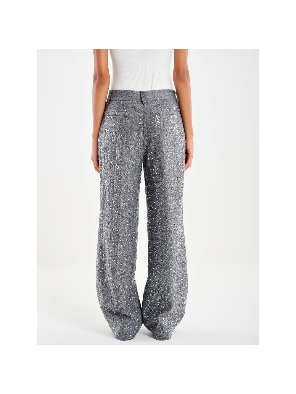 Pantalón palazzo ancho. Cierre de cremallera y gancho oculto. Tejido de espiga con lentejuelas y abalorios bordados. COMPOSICIÓN: