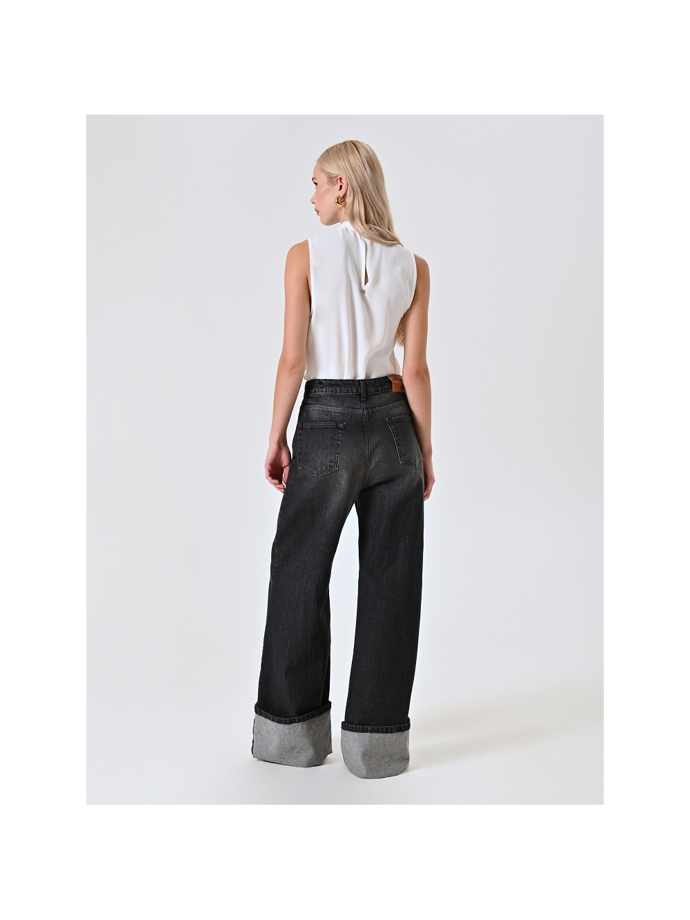 Estos vaqueros negros son el aliado perfecto para destacar con un look de diario que fusiona comodidad y estilo con un toque contemporáneo. Su confección en tejido firme presenta una estructura fluida de pernera ancha con maxidobladillo, cinco bolsillos funcionales y trabillas para cinturón. Se distingue también por el cierre con botón y cremallera, que mantiene una línea esencial y práctica. Son ideales para crear looks de diario versátiles y únicos, que podrás combinar bien con blusas suaves, camisas estructuradas o blazers de diferentes tonalidades. Todo el proceso de confección de la prenda se ha llevado a cabo en Italia. • La modelo mide 1,74 m y lleva una talla S. COMPOSICIÓN: