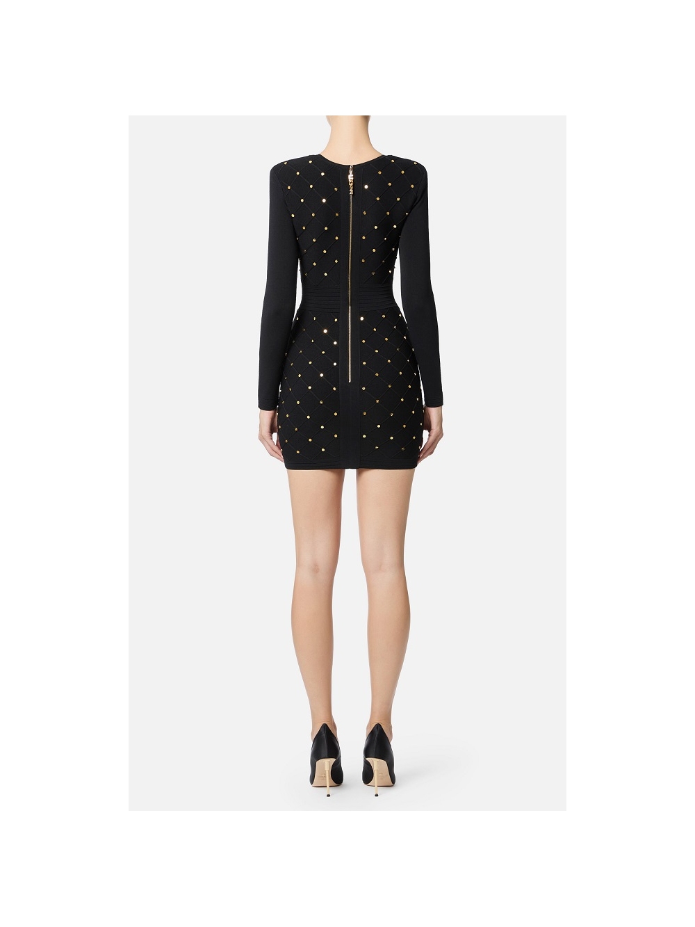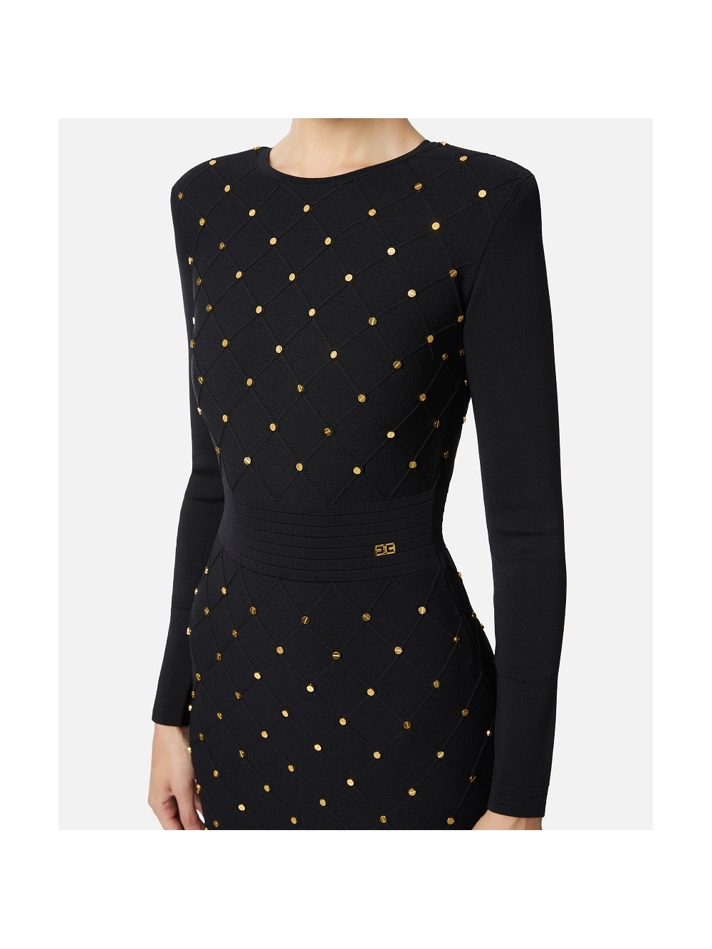 Mini vestido de punto de talla adherente. El vestido presenta hombros estructurados. cuello redondo y mangas largas. Se caracteriza por la refinada trama de rombos con nervaduras en relieve. adornada con botones de metal dorado que aportan toques de luz. La cremallera con tirador joya en la parte trasera completa la prenda. Hombreras acolchadas. Detalles de metal dorado con logotipo. Botones de metal dorado con logotipo. Cremallera con tirador joya. Largo de 85 cm para la talla 40 IT. La modelo mide 177 cm y lleva una talla 40 IT COMPOSICIÓN: