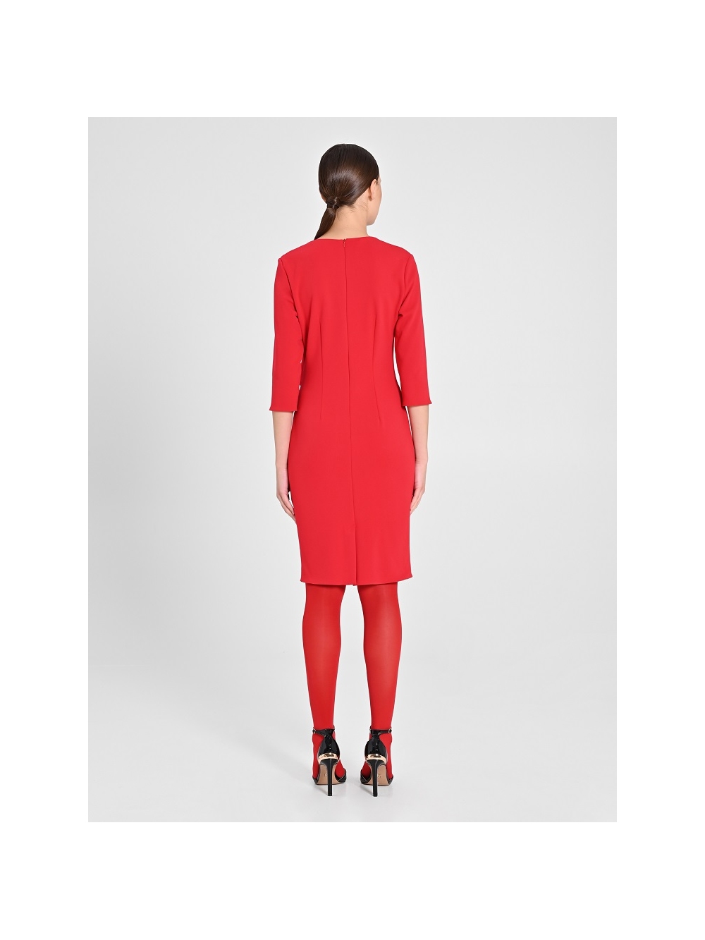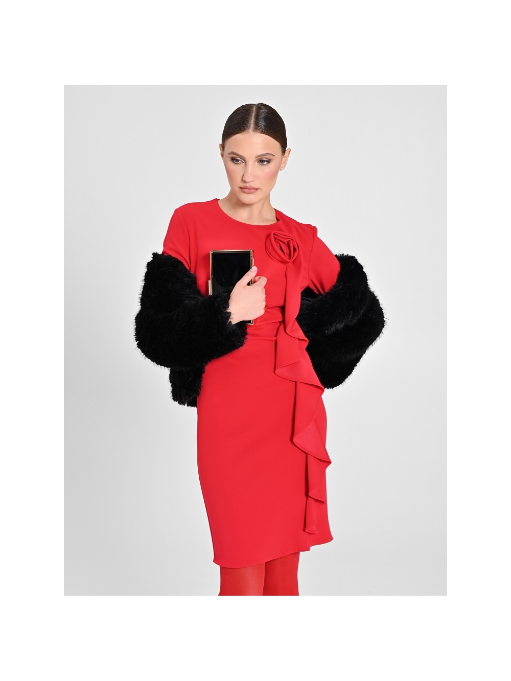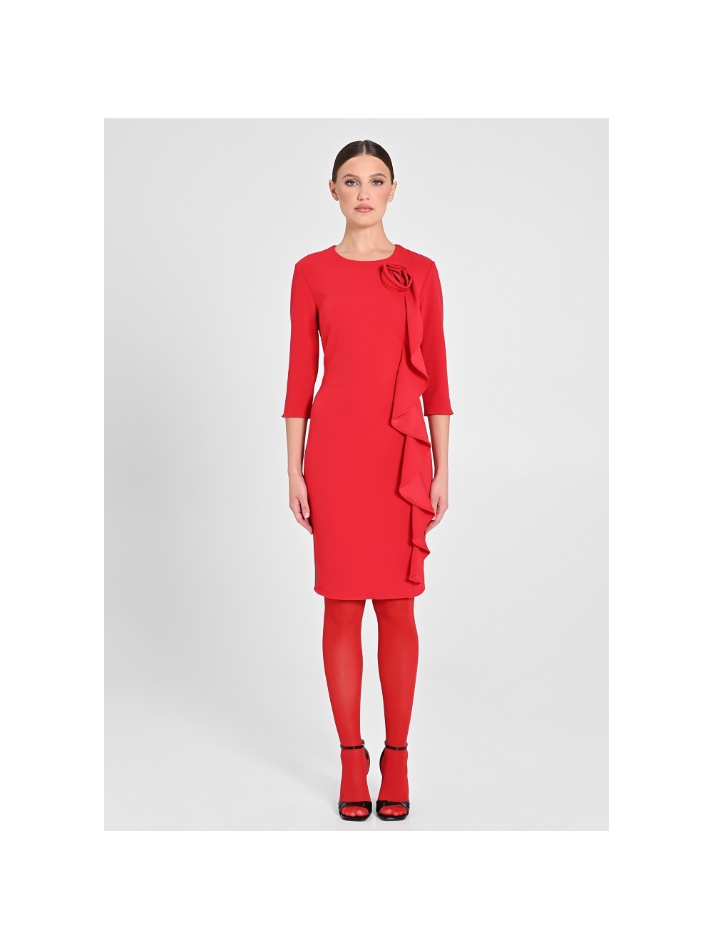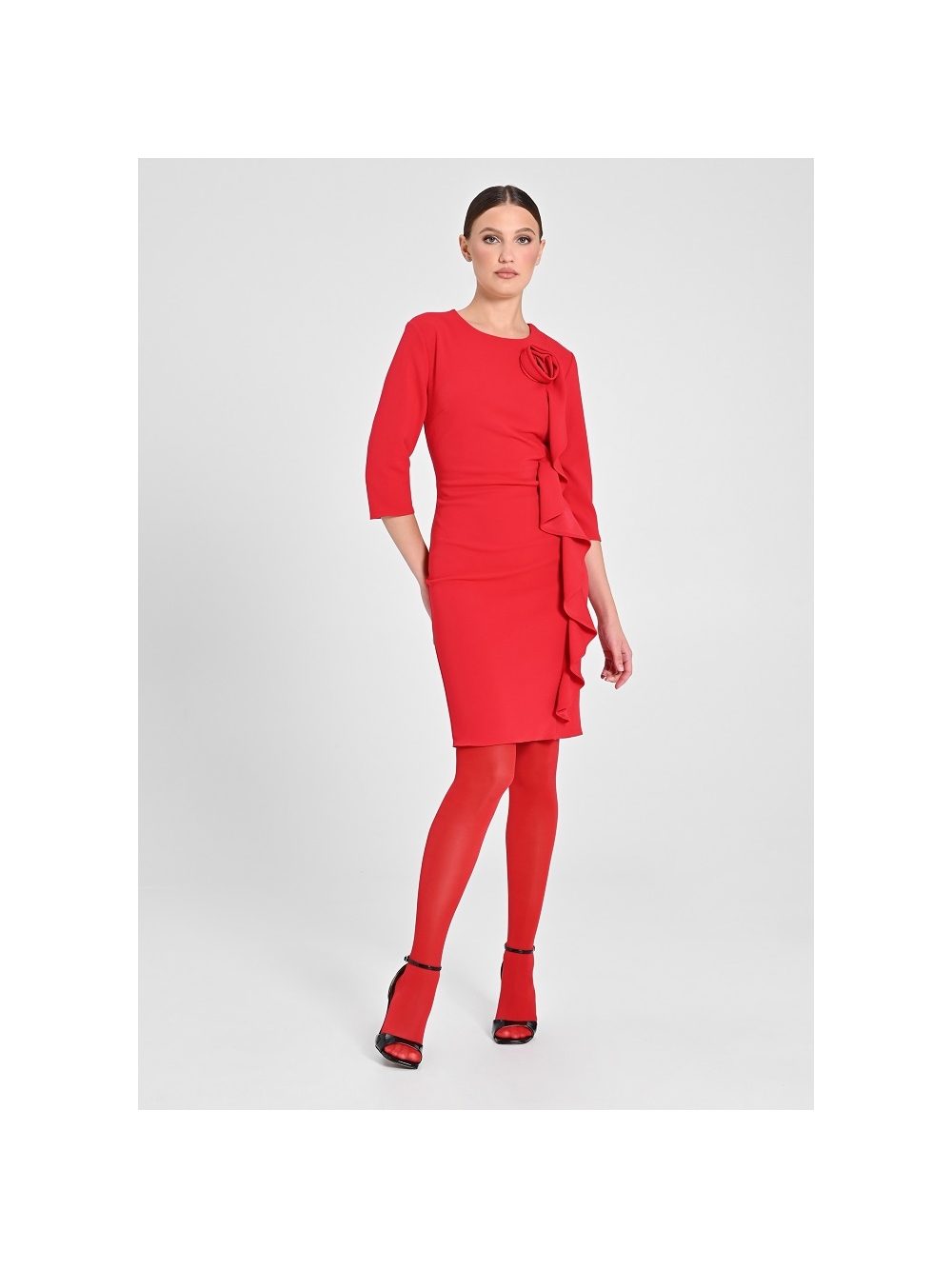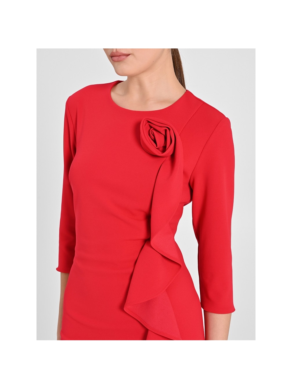 Vestido de tubo confeccionado en neopreno crepé. Este modelo de manga larga luce una coqueta rosa tridimensional que se funde con un volante alrededor de la prenda. Además, tiene escote redondo y cierre con cremallera en la parte trasera.Todo el proceso de confección de la prenda se ha llevado a cabo en Italia. La modelo mide 1,76 m y lleva una talla S, que se corresponde con las siguientes medidas: contorno de pecho 38 cm, cintura 34 cm y longitud 103 cm. COMPOSICIÓN: