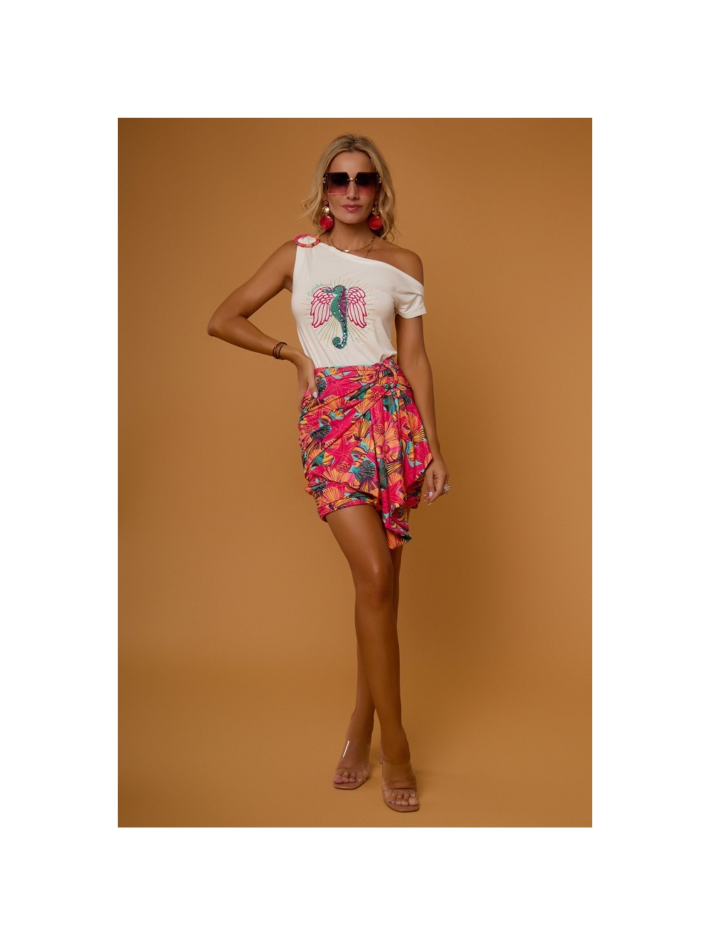 Falda corta, con estampada en color rosa fucsia, azules y naranjas. La falda es fruncida y lleva una hebilla en el lateral y de ahí sale tela de la falda que cae sobre la pierna. Se cierra en la parte trasera, con cremallera invisible. Medidas talla S: Cintura 69 Cadera 94 Largo 44 COMPOSICIÓN: