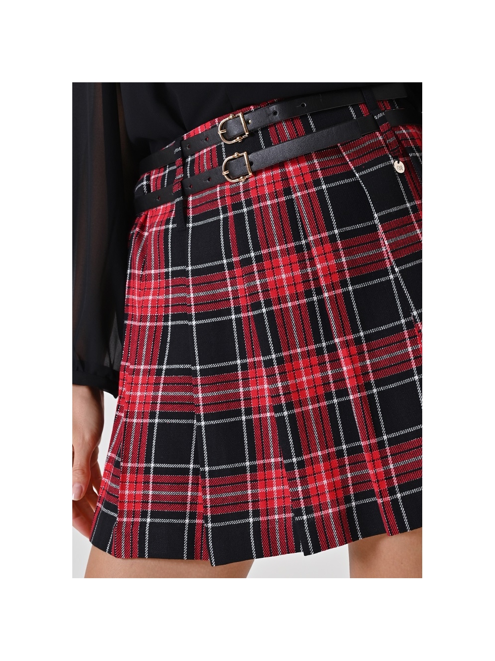 Confeccionada en un llamativo tejido de cuadros con discretos hilos de lúrex que le aportan luminosidad, la falda se distingue por su corte evasé en línea A y su talle alto, que realzan la silueta. El diseño se enriquece con densas tablas que le confieren volumen y movimiento, y con el detalle distintivo de las dos correas de piel sintética con hebillas metálicas doradas en el lateral, un toque atrevido y de plena tendencia. El cierre de cremallera lateral garantiza un ajuste impecable y cómodo. Prenda confeccionada en Italia. La modelo mide 1,76 m y lleva la talla S. COMPOSICIÓN:
