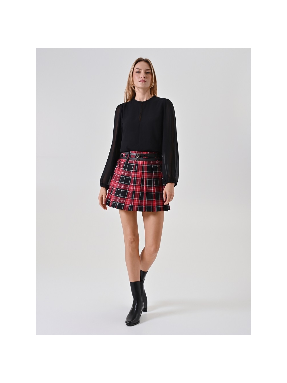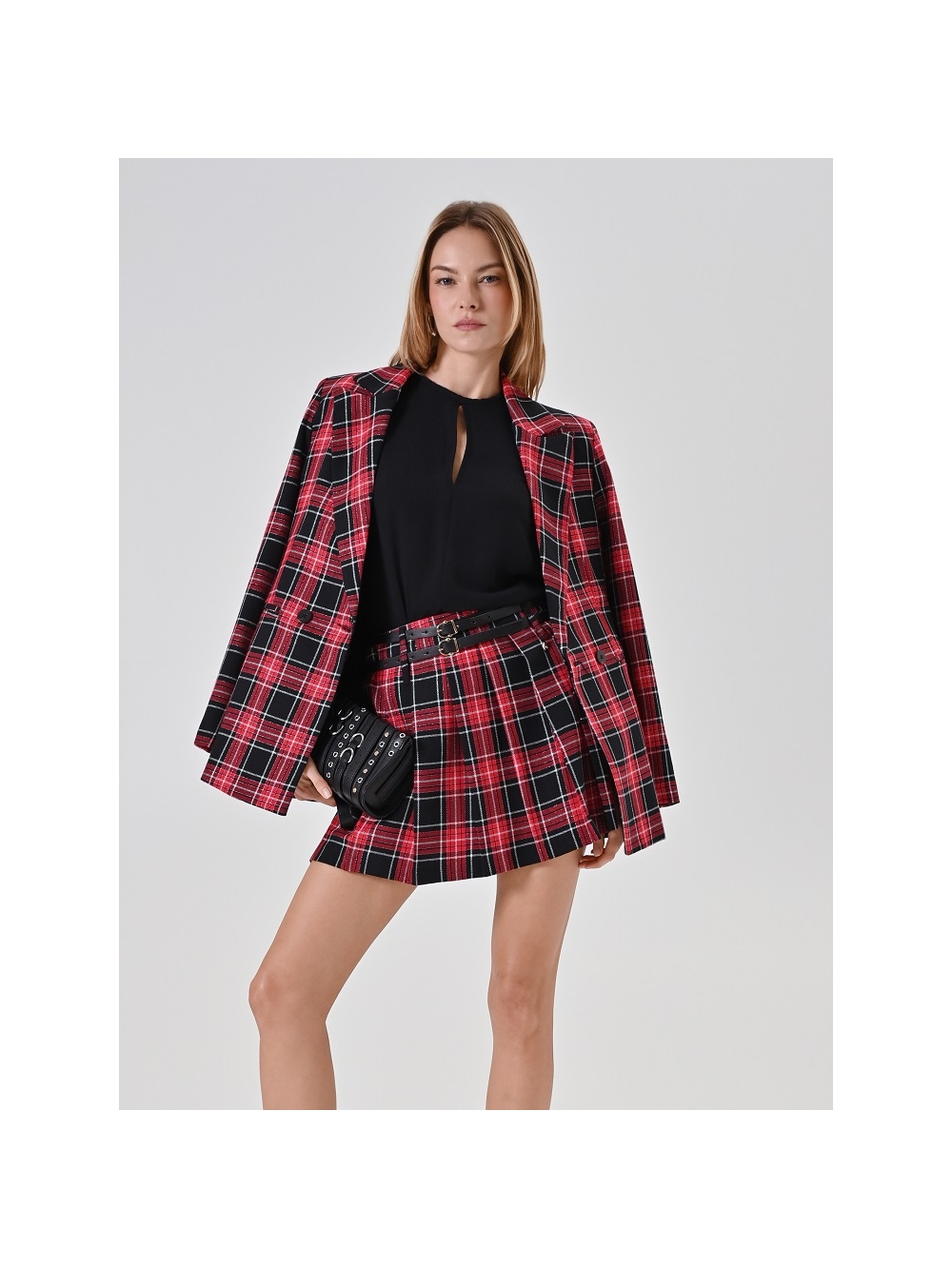 La minifalda de tablas de cuadros con lúrex roja es toda una declaración de estilo con carácter, que reinterpreta un clásico del armario invernal con un toque contemporáneo y femenino.