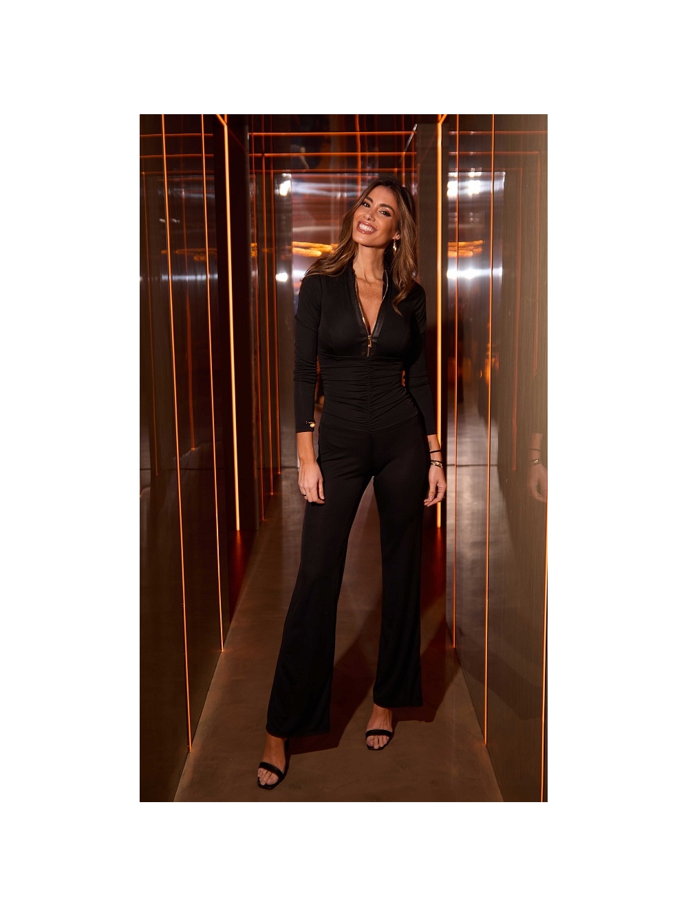 Mono negro de punto fluido, de manga larga con escote en pico regulable con cremallera dorada, drapeado desde bajo del pecho hasta la cadera. Se abrocha con cremallera invisible en la espalda. COMPOSICIÓN: