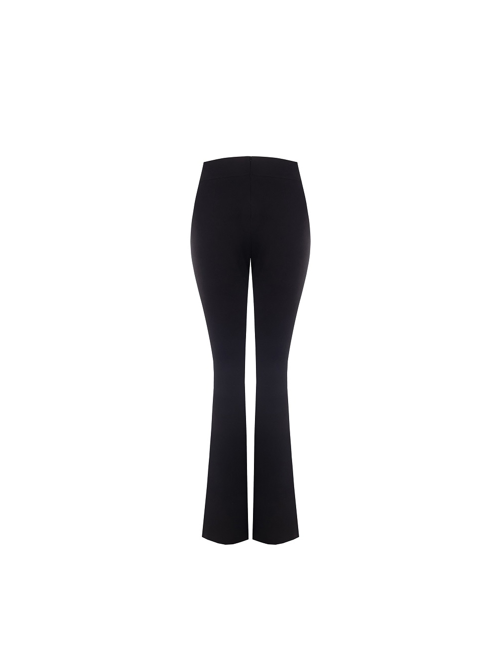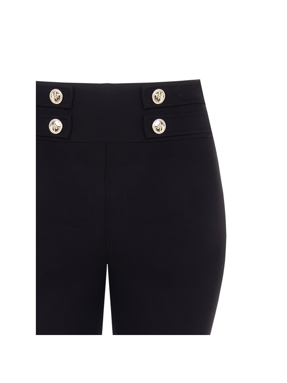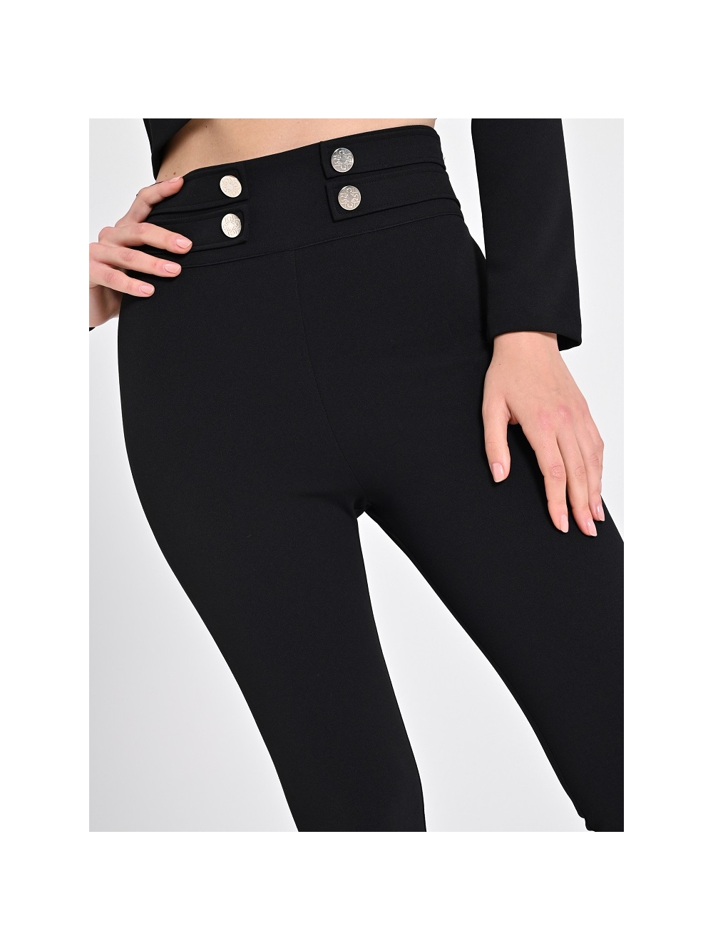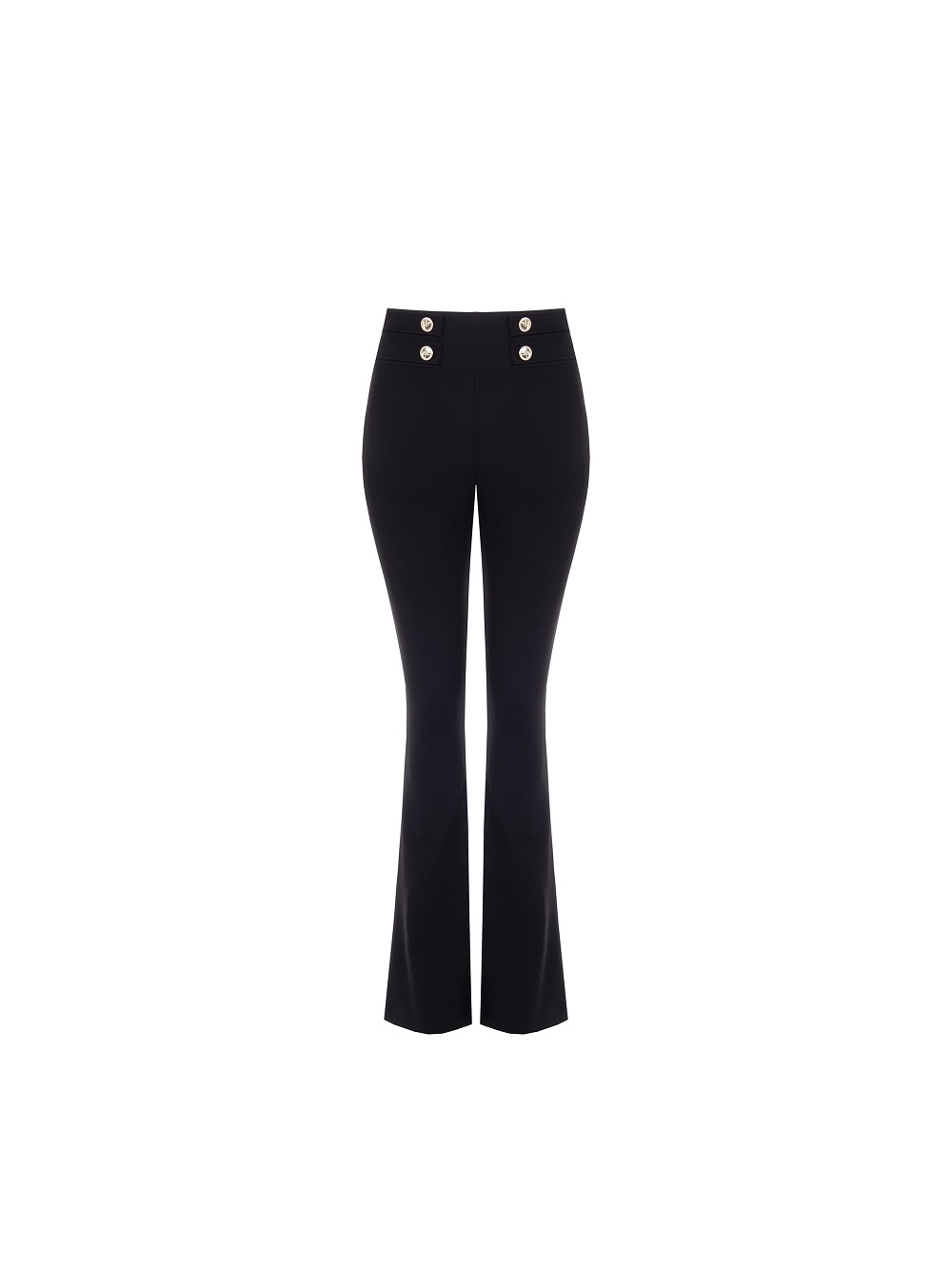 Pantalón acampanado, confeccionado en tejido técnico. Los pantalones están adornados con botones dorados en la cintura. Completa tu outfit y compra la chaqueta a juego junto con el pantalón. La prenda está íntegramente confeccionada en Italia. El modelo mide 1,74 m y lleva la talla S. Feedback COMPOSICIÓN: 95% POLIESTER 5% ELASTANO