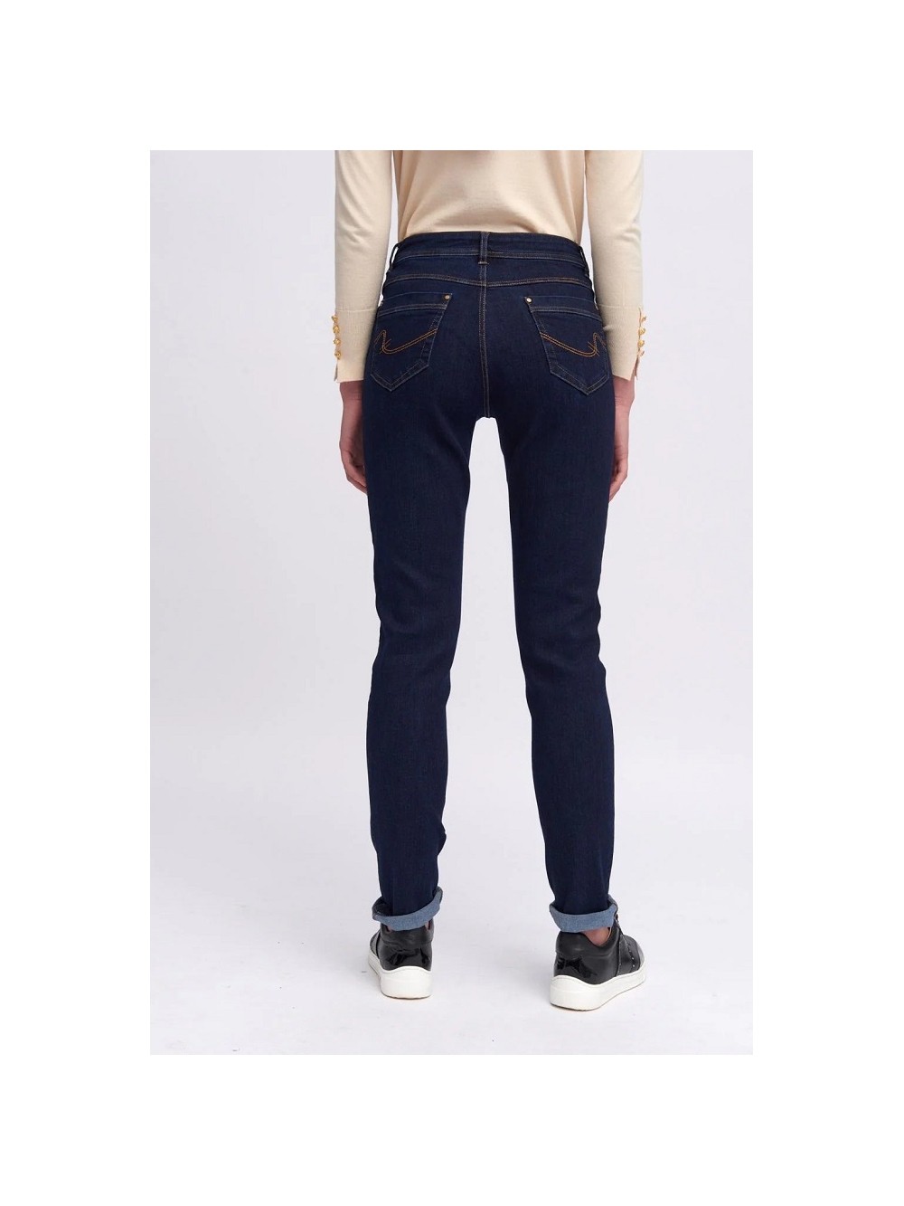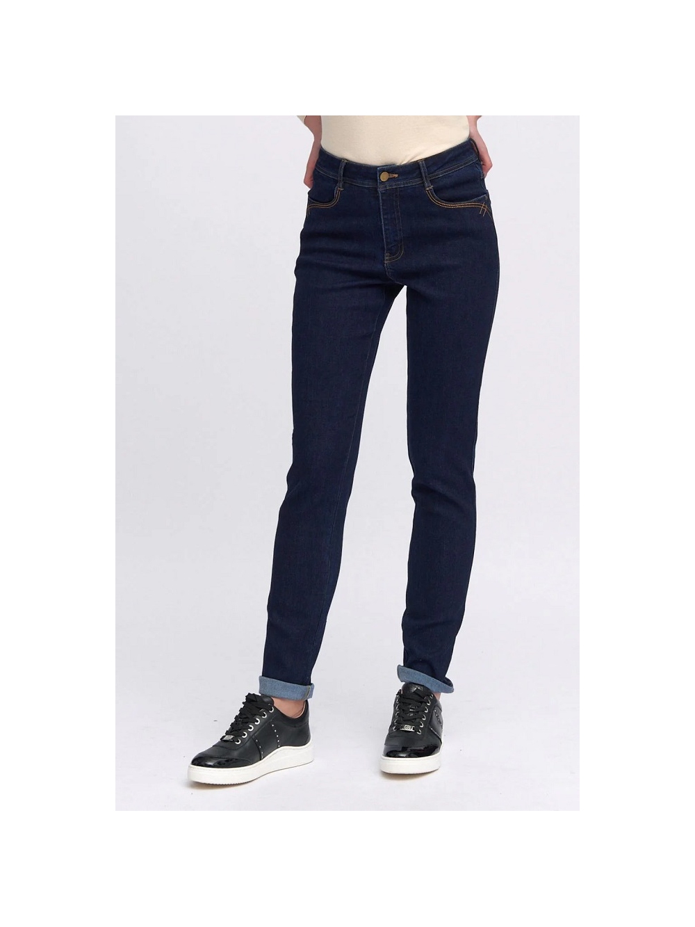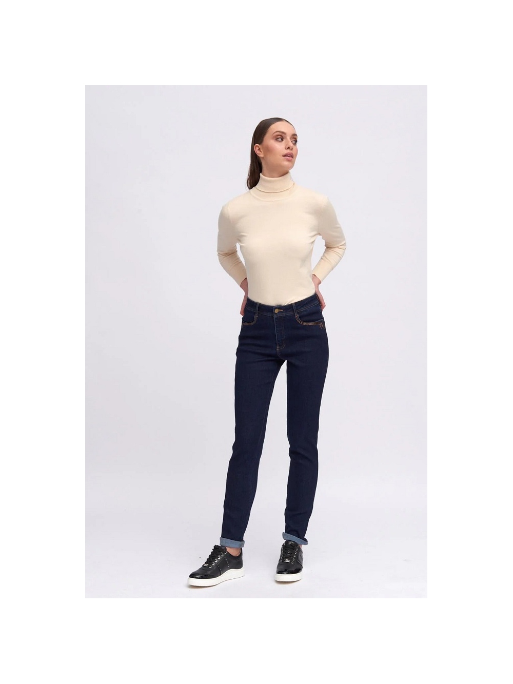Pantalón skinny denim. Tiro medio. Tejido elástico. Cintura con trabillas. Cierre frontal con cremallera oculta y botón. Diseño de cuatro bolsillos. Detalle de costuras a contraste. COMPOSICIÓN: