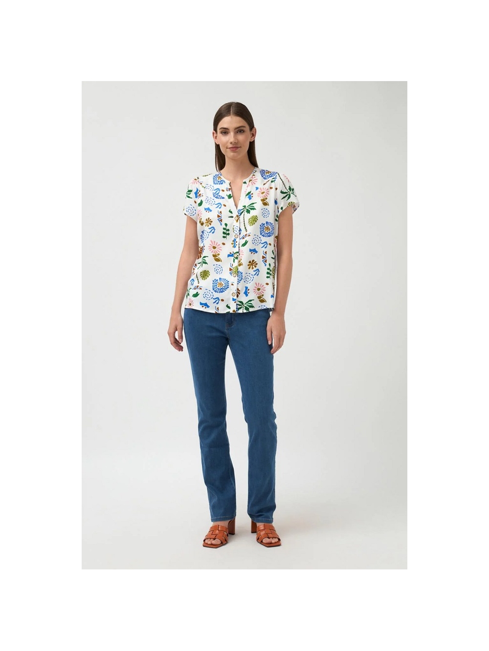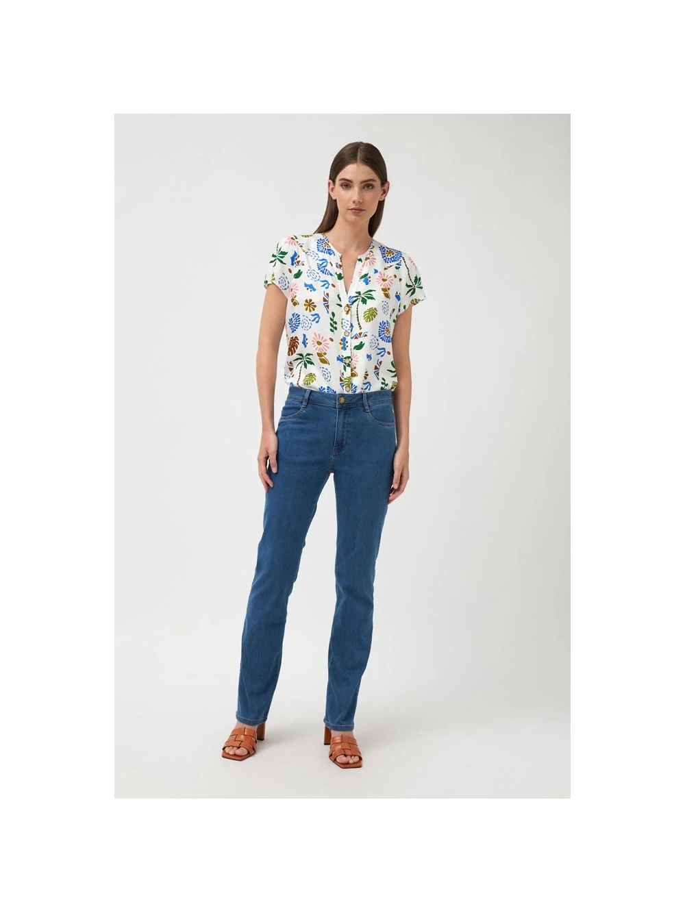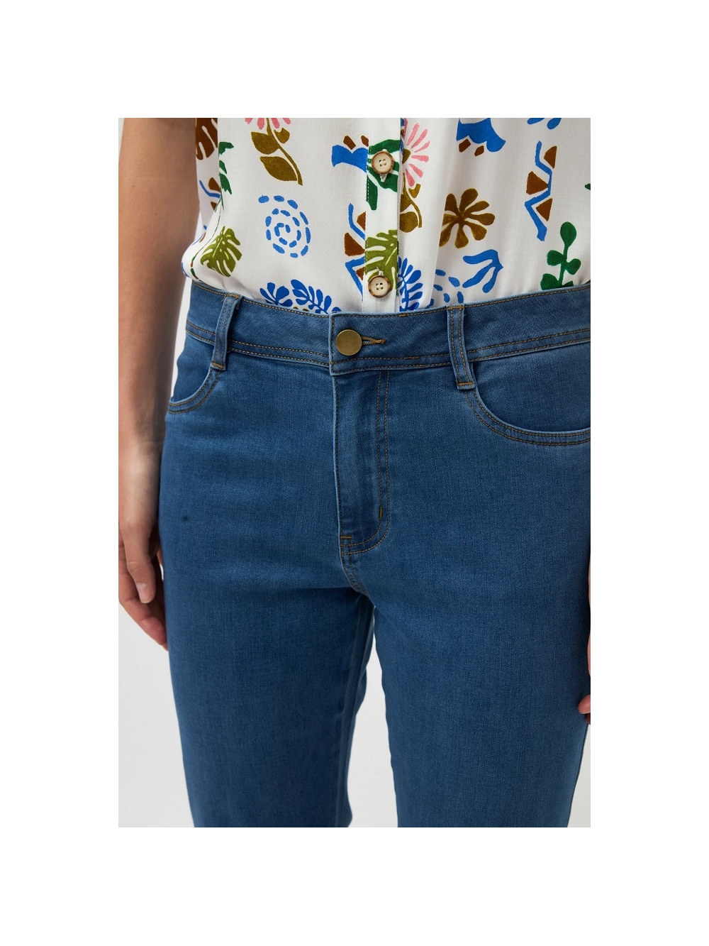 Pantalón vaquero cinco bolsillos. Tiro medio. Cierre con botón y cremallera. Bajo recto. COMPOSICIÓN: