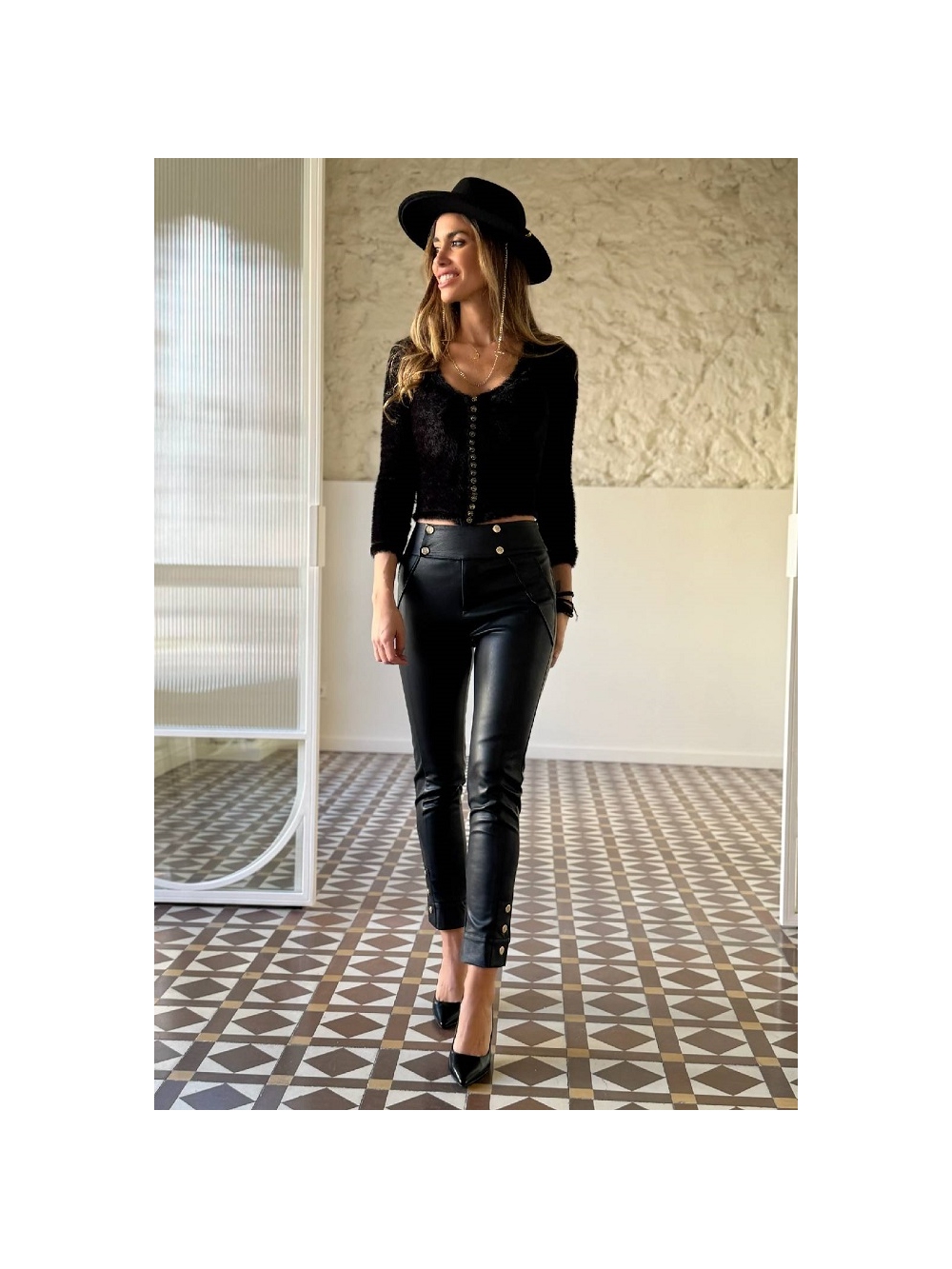 Pantalón negro de ecopiel recto de talle alto, con botones dorados. Detalle botones en bajo. Forro térmico. Cierre con botones y cremallera. COMPOSICIÓN: