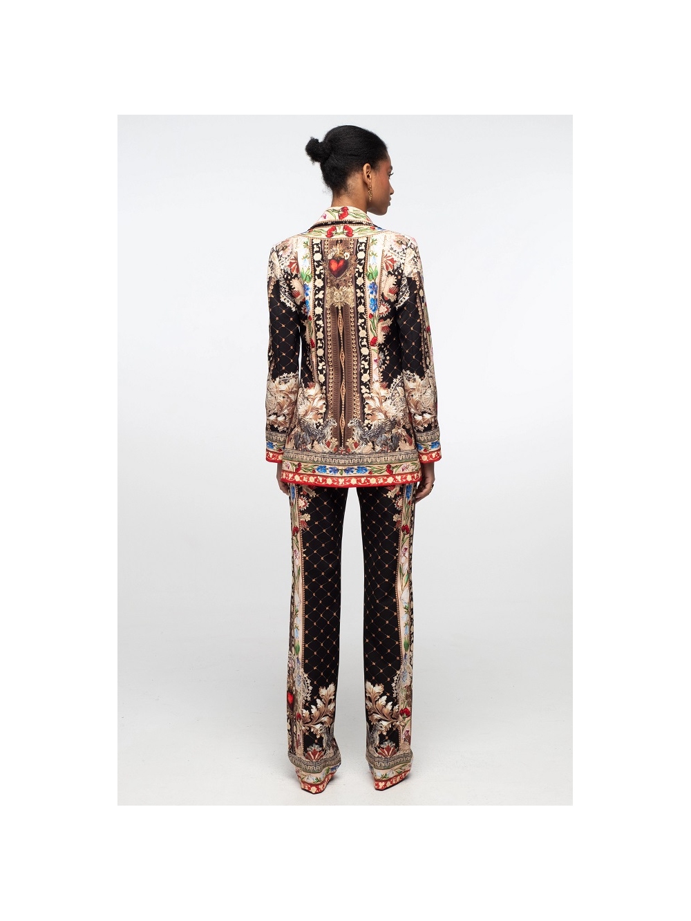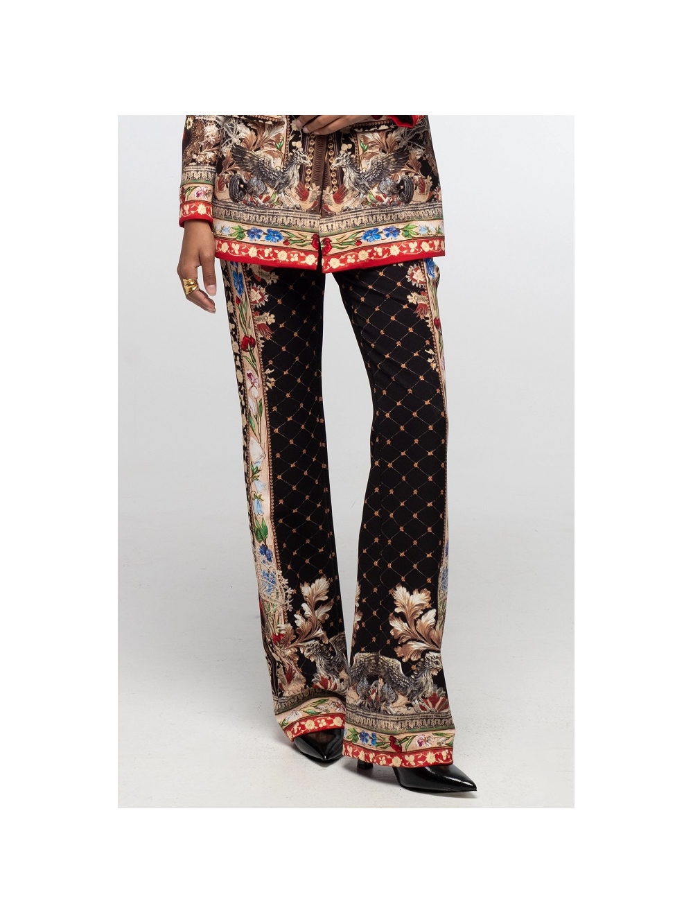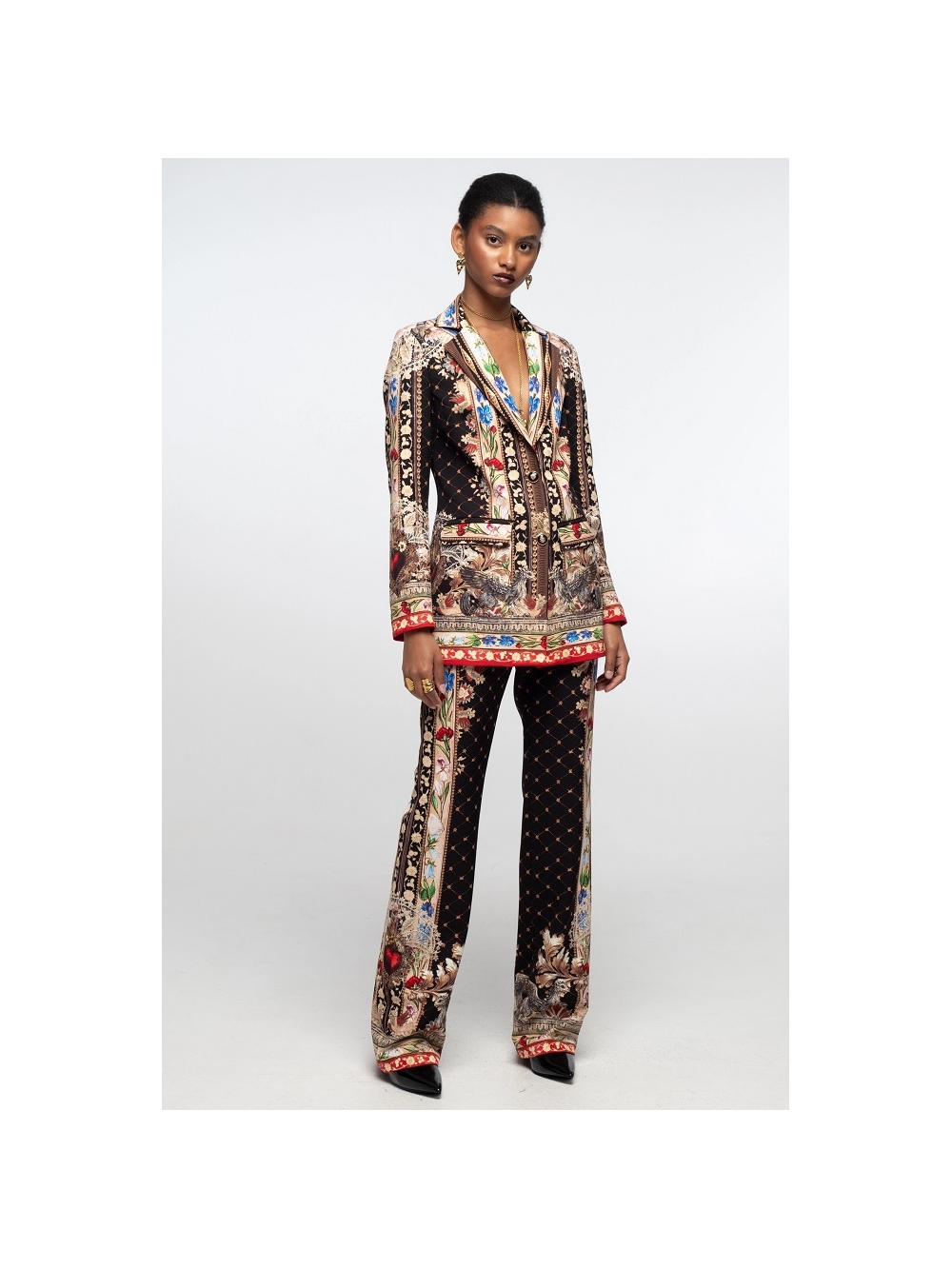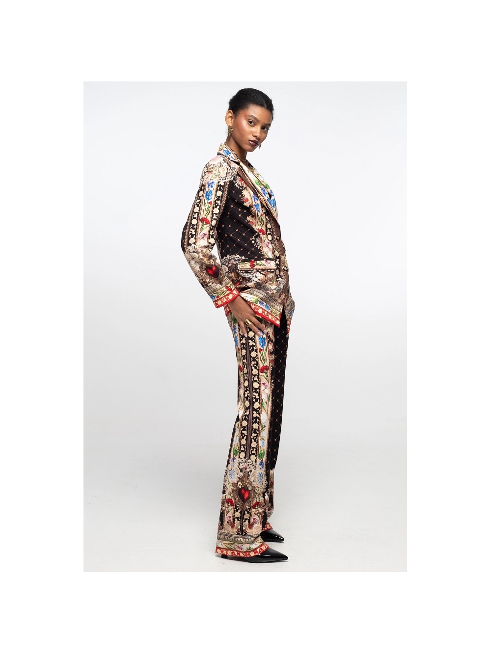 Pantalones Opulence combinan un estampado ornamental con flores en tonos joya, criaturas míticas y motivos de entramado y encaje sobre negro. Estos pantalones de corte recto presentan detalles de sastrería como un botón de estilo vintage y bolsillos laterales. Luce una imagen impactante y combínalos con un blazer Opulence a juego para un look formal exquisito. Descubre el excepcional estampado de esta prenda, confeccionada con la técnica de colocación. Cada pieza presenta un estampado único que, al combinarse, crea una auténtica obra maestra. Pantalones de corte recto con botón de estilo vintage. Bolsillos laterales. Diseñadores griegos. COMPOSICIÓN: