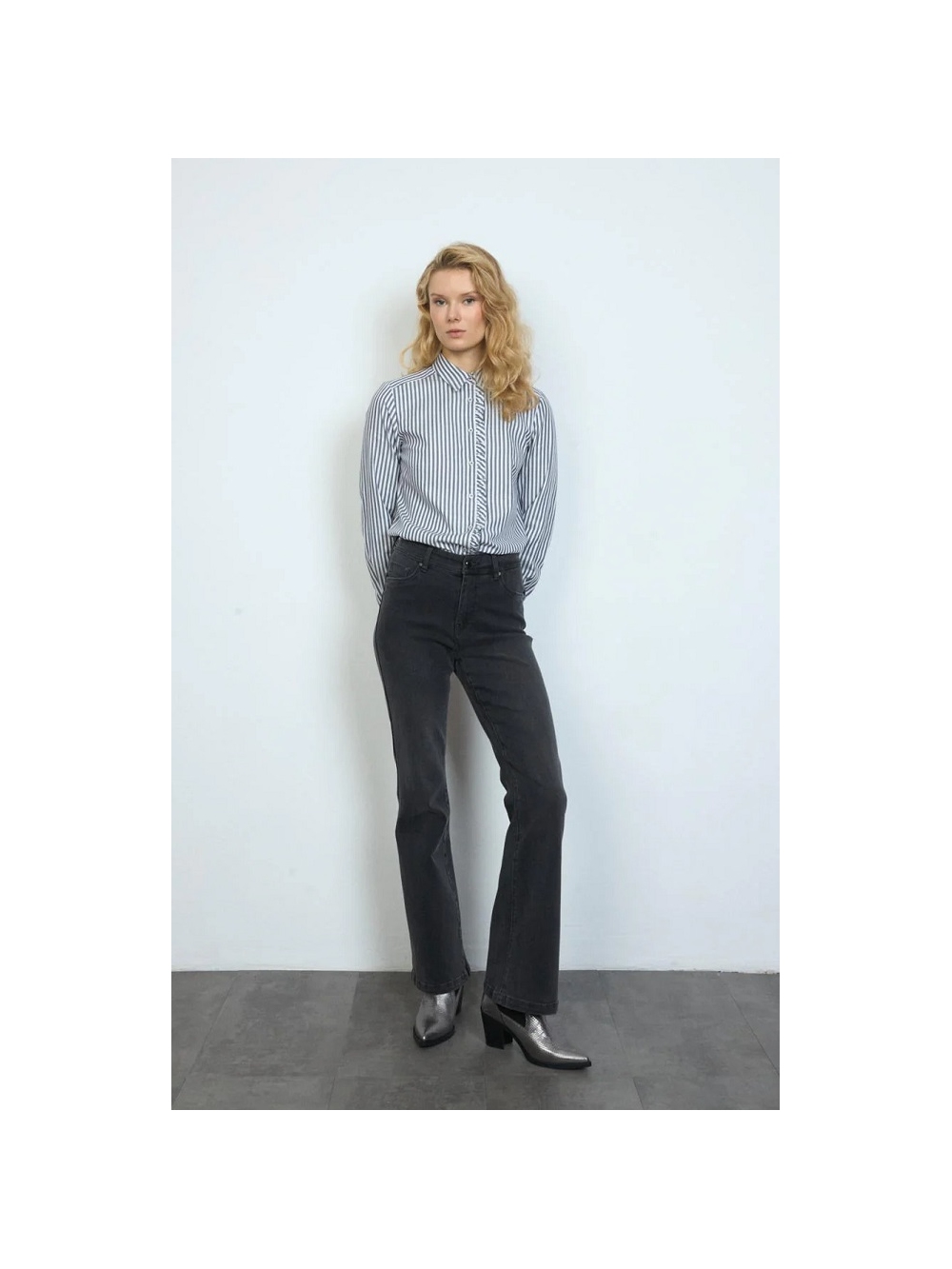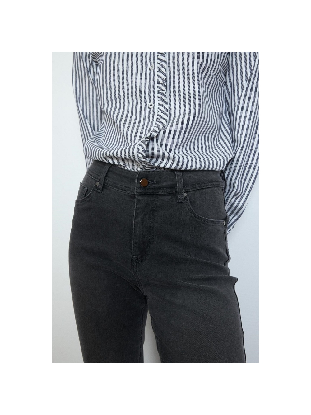 Pantalón vaquero recto. Tiro alto. Cintura con trabillas. Cierre frontal con cremallera oculta y botón al tono. Bolsillos frontales. COMPOSICIÓN: