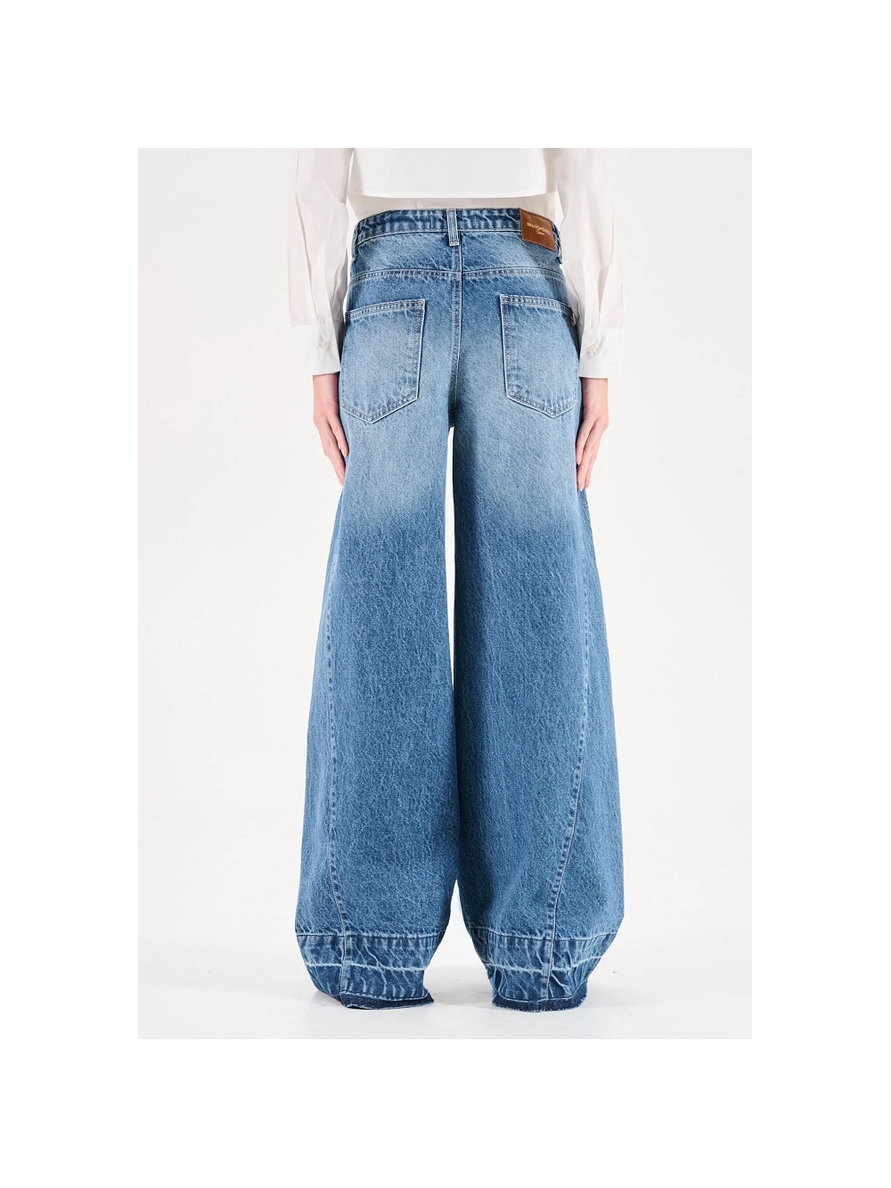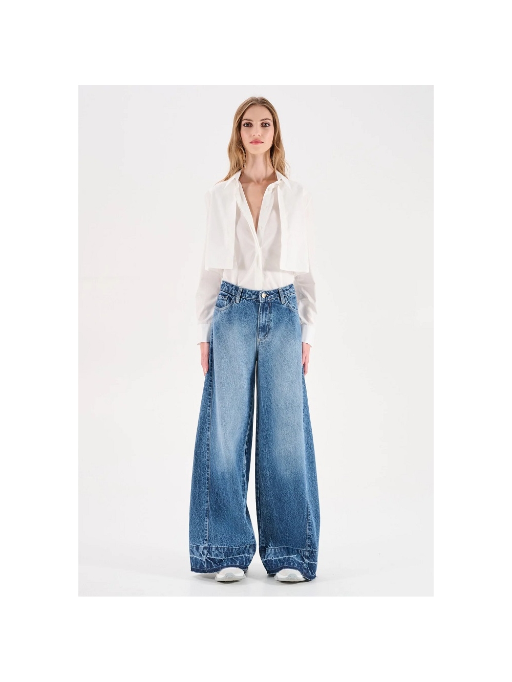 Una silueta contemporánea y un detalle con carácter distinguen a los nuevos vaqueros azules de pernera ancha, una prenda versátil pensada para el día a día. Modelo de cinco bolsillos y talle alto, se caracterizan por una pernera recta y muy ancha que crea un volumen rotundo y de tendencia. Confeccionados en denim, presentan un lavado de color azul medio con un degradado que se oscurece gradualmente hacia el bajo. El detalle que los hace únicos es la ancha vuelta con lavado a contraste, con un efecto arrugado y un bajo de corte sin rematar ligeramente deshilachado.