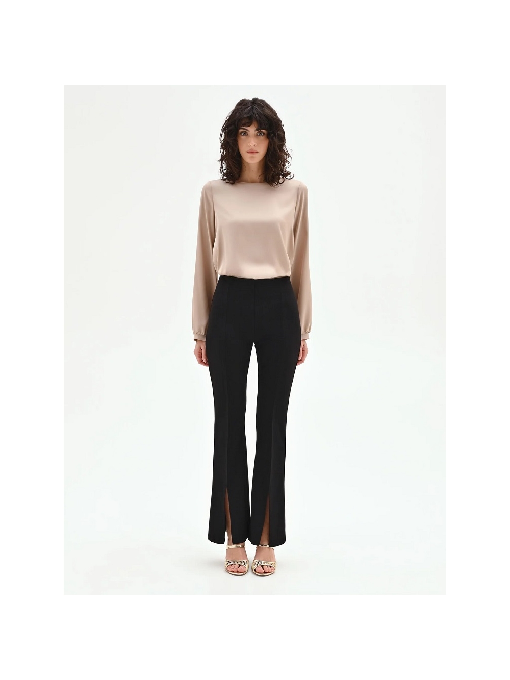 Una silueta contemporánea que combina estructura y fluidez, diseñada para la mujer que busca una elegancia funcional. Confeccionado en crepé scuba, este pantalón define la figura con su talle alto y su línea ajustada en el muslo, que se abre gradualmente en un bajo acampanado. La nervadura central le confiere verticalidad al modelo, un detalle que estiliza ópticamente la pierna. La protagonista del diseño es la abertura frontal en el bajo, un elemento de estilo que aporta dinamismo y deja entrever el calzado con elegancia. La prenda se completa con un cierre de botones. Prenda confeccionada en Italia. La modelo mide 1,80 m y lleva la talla S. COMPOSICIÓN: 95% POLIESTER 5% ELASTANO
