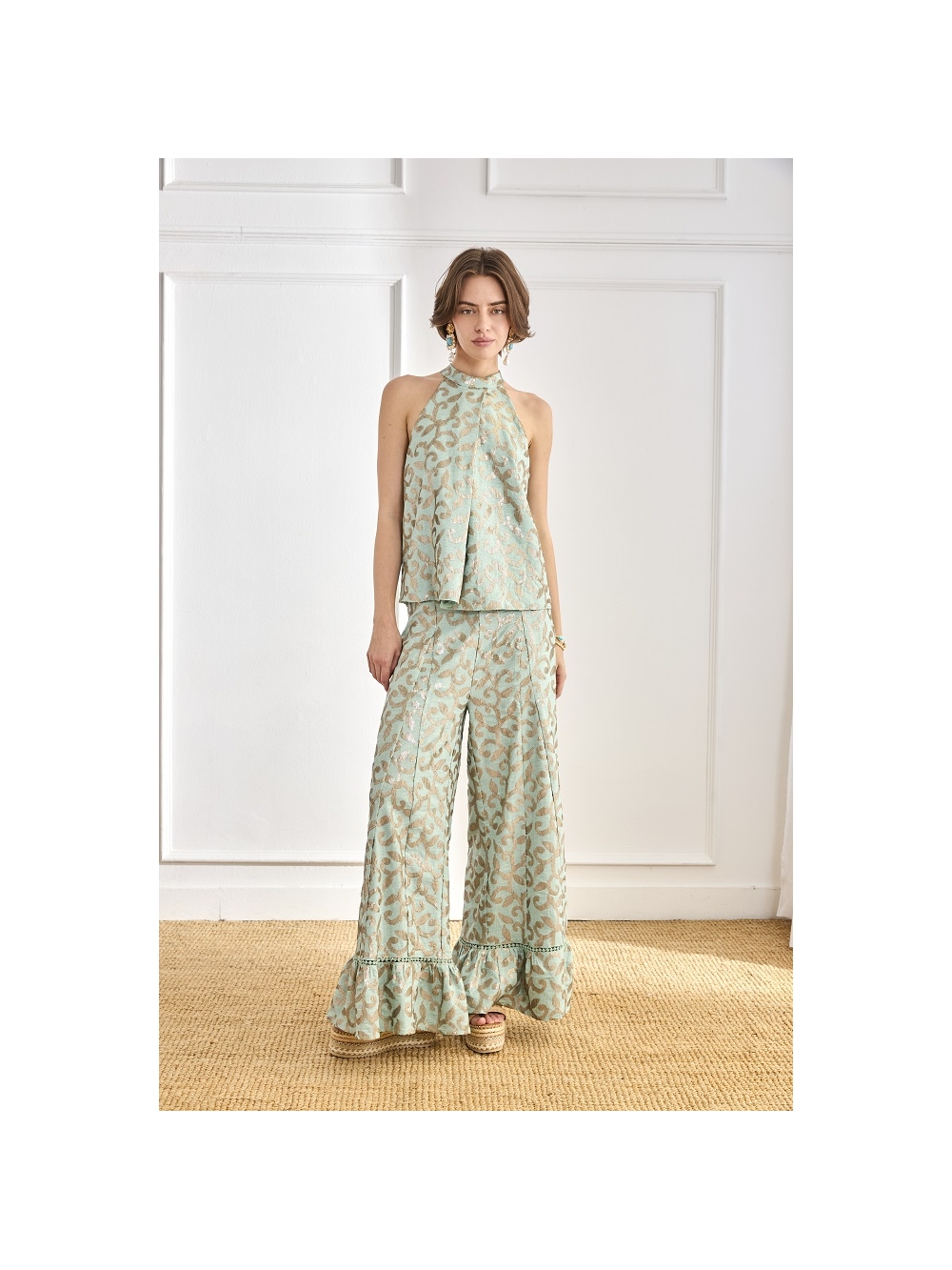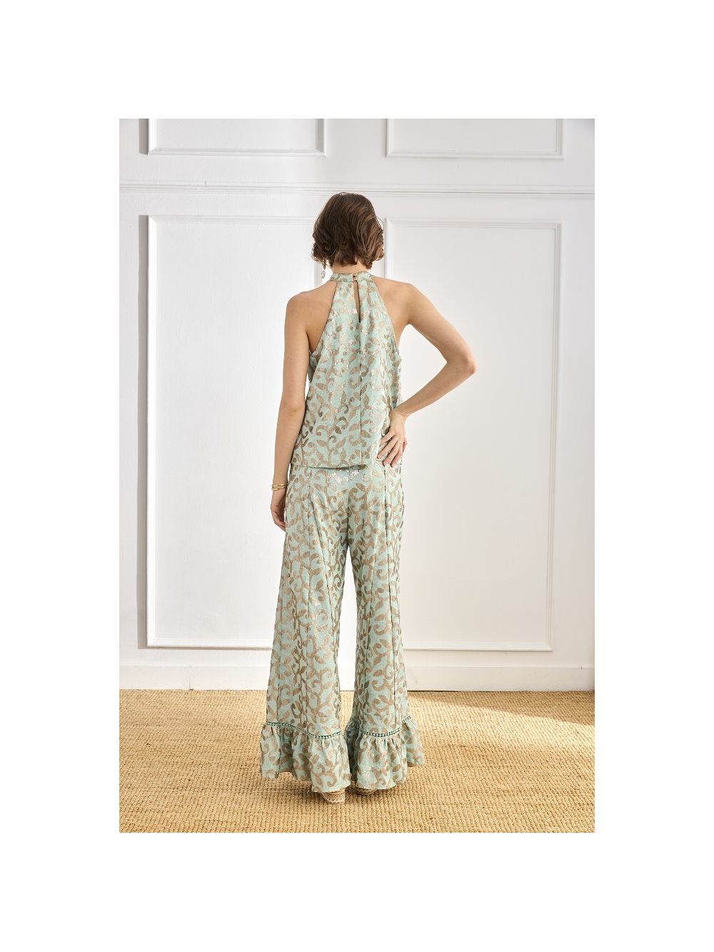 PANTALON CON VOLANTES EN BAJO Y LENTEJUE