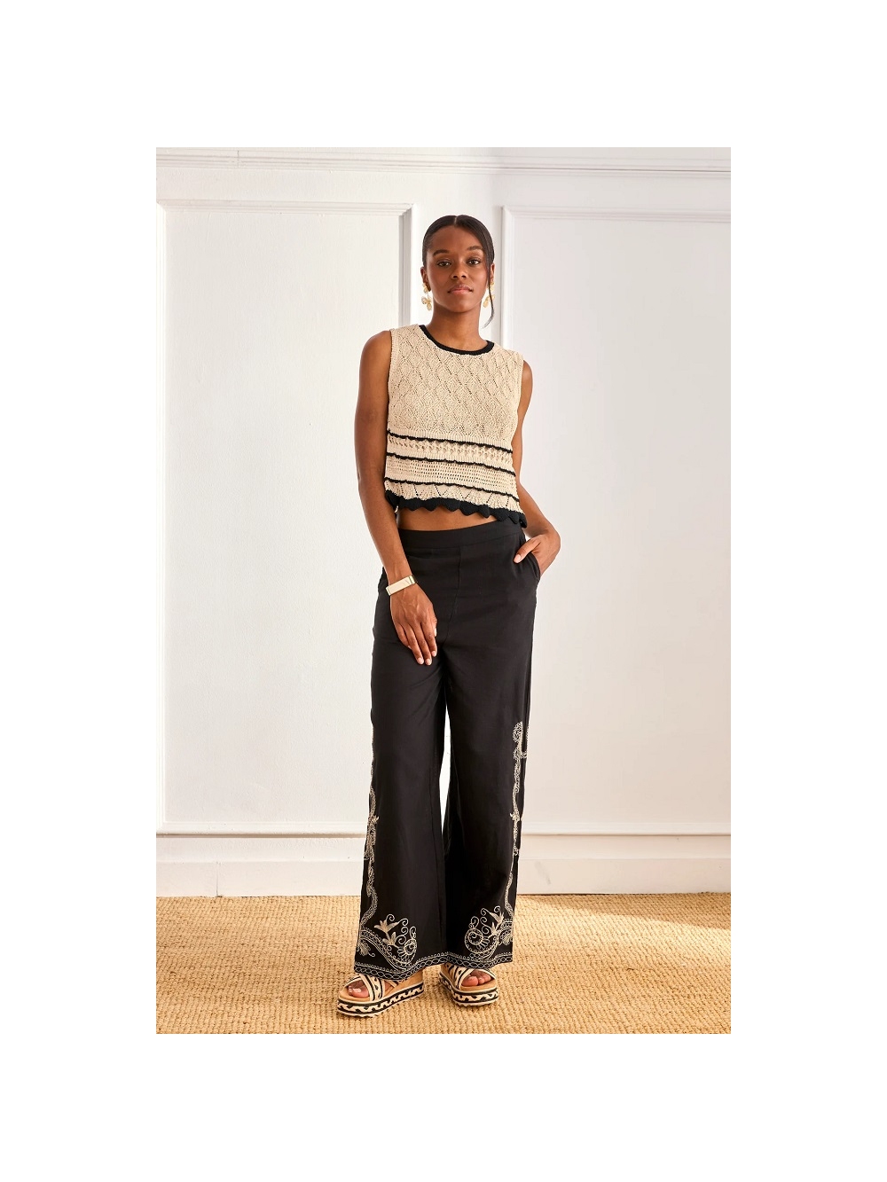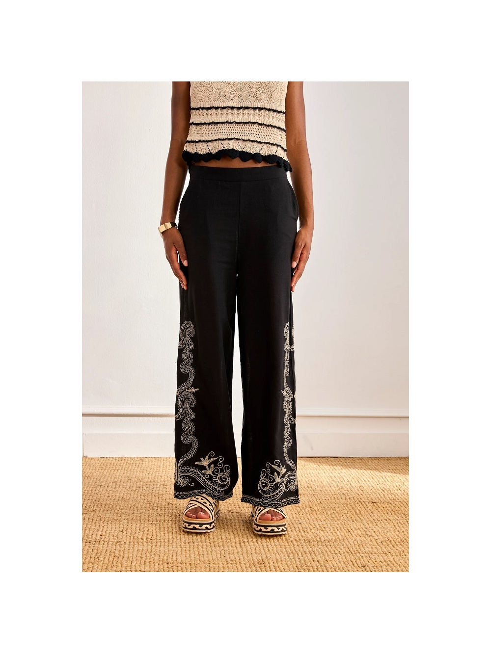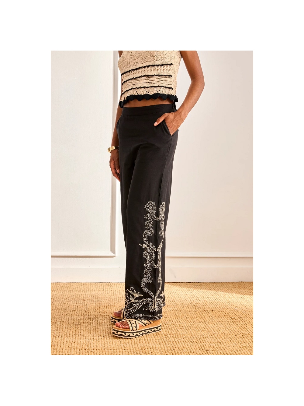 Pantalón largo con bolsillos laterales. Detalle de motivos bordados en contraste de color en los bajos. Cremallera invisible en un lateral. COMPOSICIÓN: 100º/ₒ ALGODON