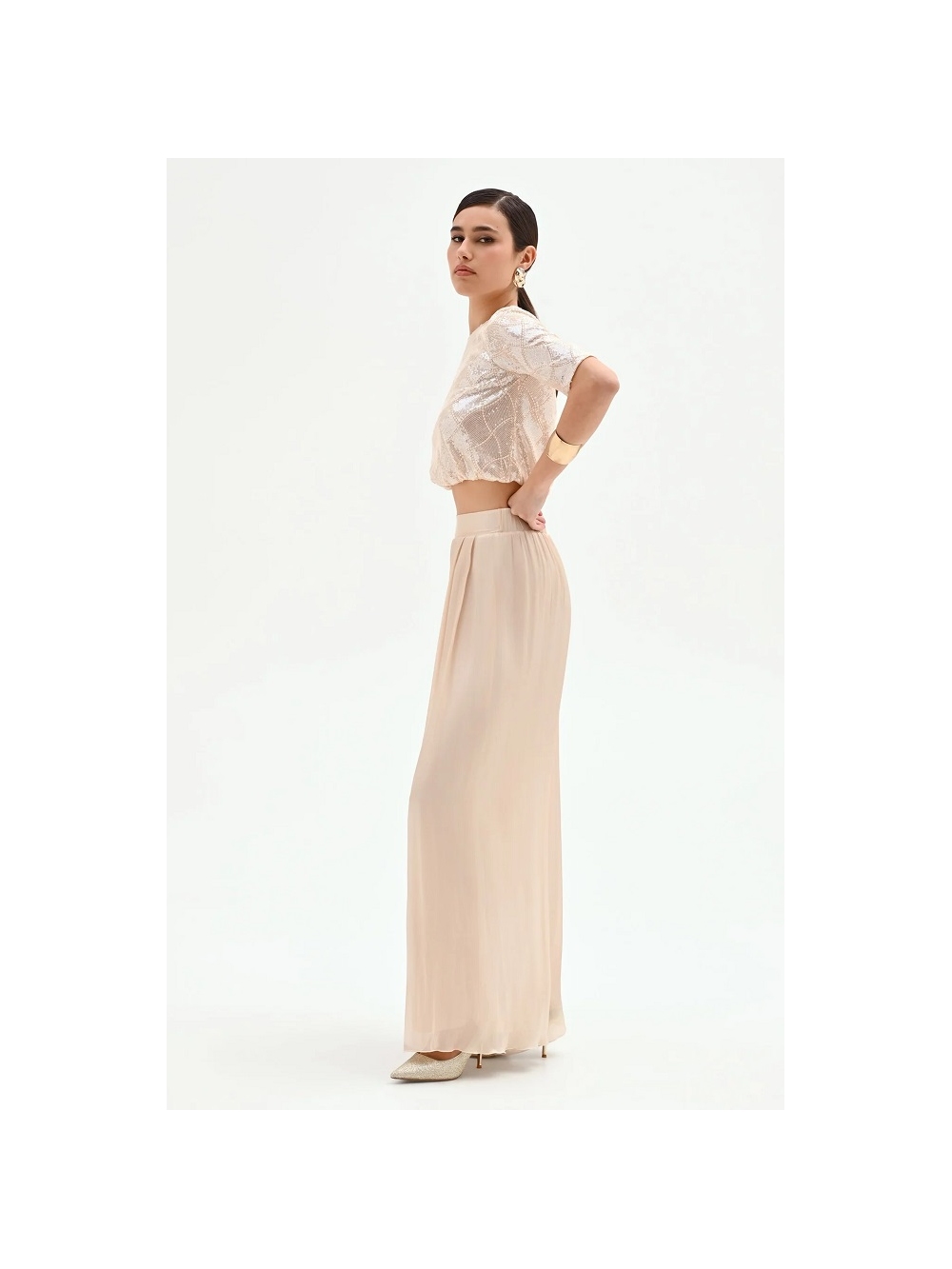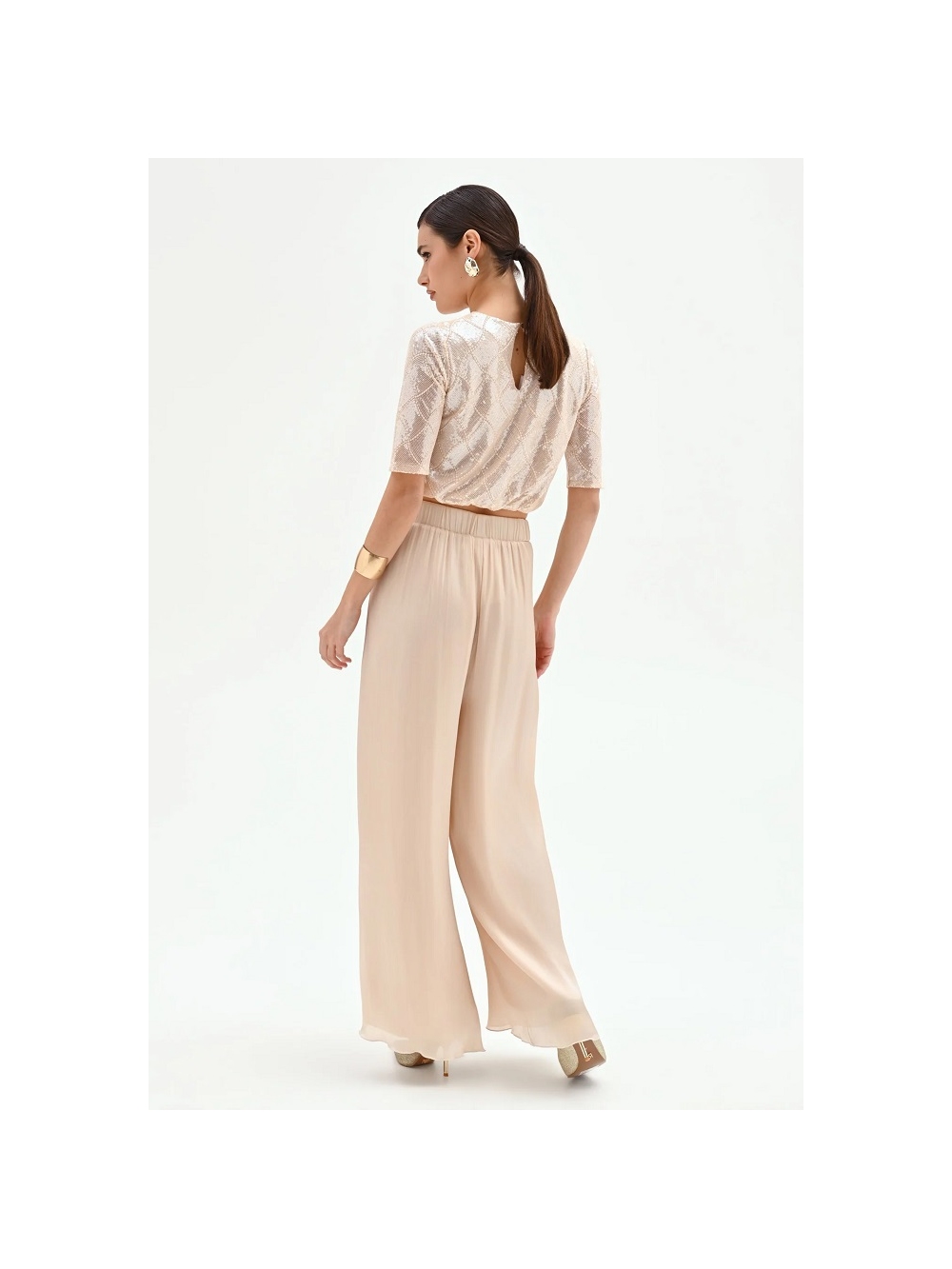 Un juego de luz y fluidez define el diseño del pantalón palazzo. una prenda pensada para acaparar todas las miradas con su elegancia discreta y luminosa. El talle alto se realza con una cinturilla lisa de la que nacen suaves pliegues. un detalle que aporta amplitud y un movimiento casi líquido a la silueta. Confeccionado en satén tornasolado. el pantalón cae con ligereza a lo largo de la pernera recta hasta el suelo. creando un efecto óptico alargado y sofisticado que estiliza la figura a cada paso. Su tonalidad neutra. un beis claro con delicados reflejos. lo convierte en una prenda extremadamente versátil y refinada. fácil de integrar en distintos looks para las ocasiones más especiales. Prenda confeccionada en Italia. La modelo mide 1.77 m y lleva la talla S. COMPOSICIÓN: 100º/ₒ POLIESTER