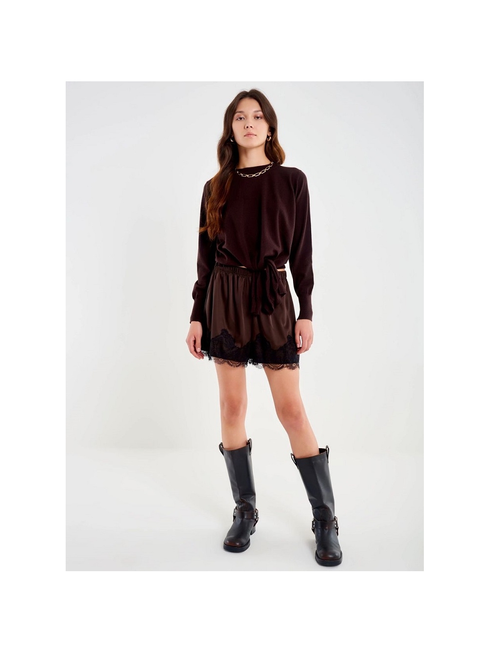 Pantalón corto de raso con encaje en la parte inferior. Cintura elástica. El modelo mide 178 cm con alas y lleva talla única COMPOSICIÓN: 95º/ₒ POLIESTER 5º/ₒ ELASTANO