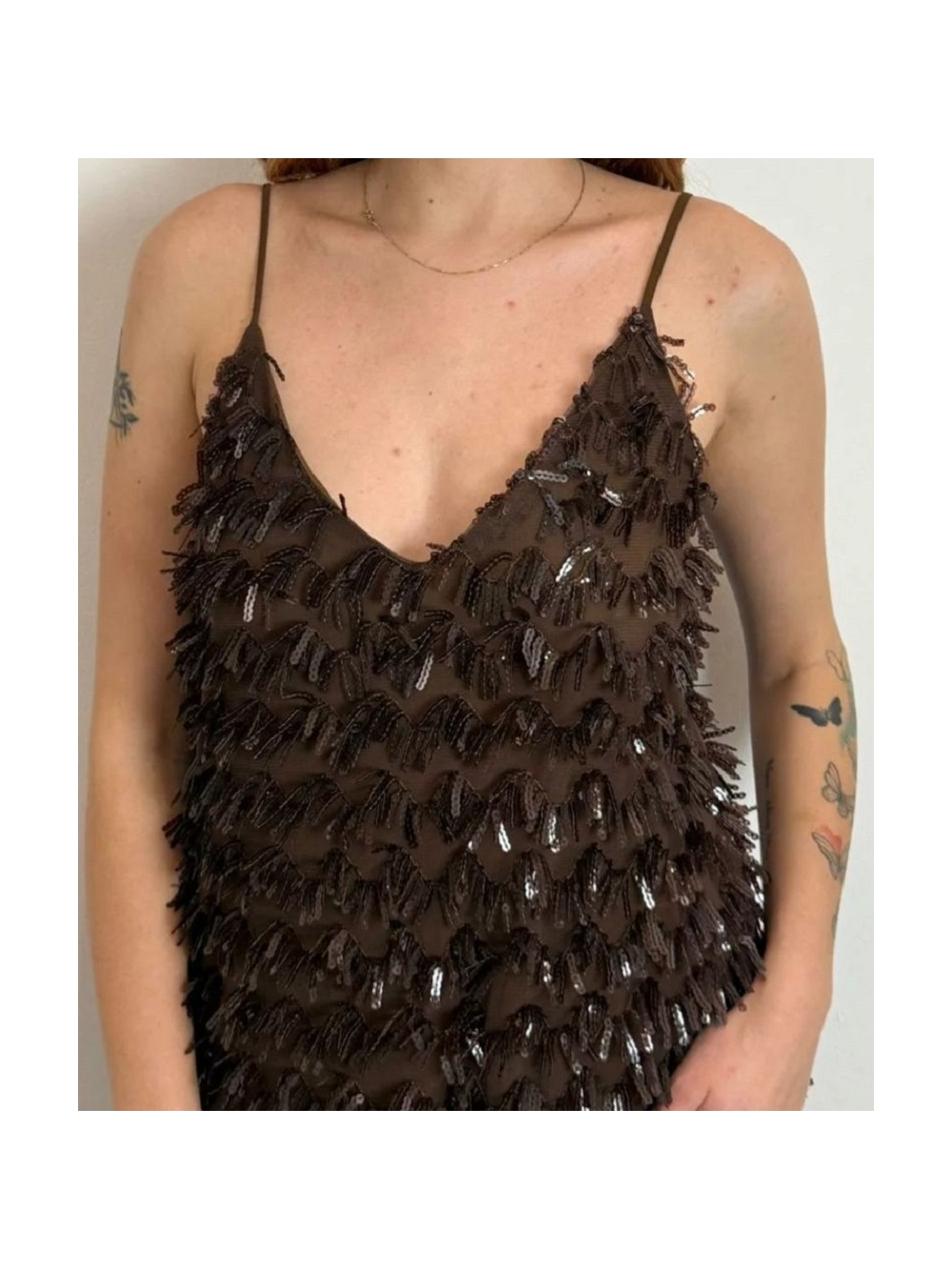 Top de tirantes con escote en V en tul y lentejuelas. Tirantes finos ajustables. COMPOSICIÓN: 100% POLIESTER