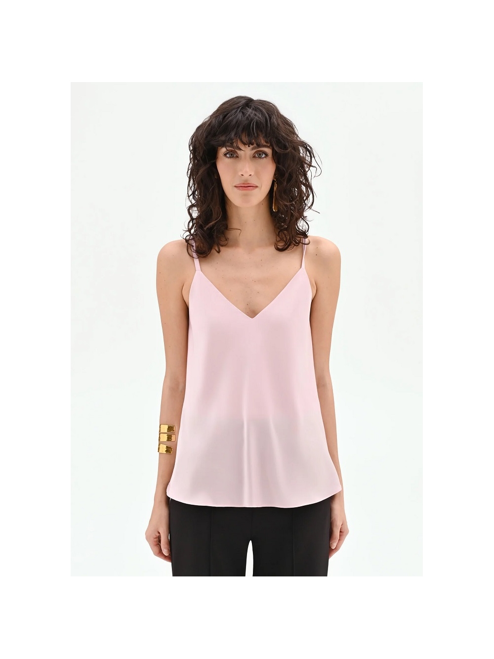 La delicadeza del rosa pastel se une a la fluidez del satén en este top esencial. una prenda clave para crear looks versátiles y siempre femeninos. Su silueta depurada se define por un favorecedor escote en V y unos tirantes finos que dejan los hombros al descubierto con elegancia. El tejido. liso y ligero. se desliza sobre el cuerpo. con una caída fluida y una línea ligeramente evasé que garantiza comodidad y libertad de movimiento. Una discreta transparencia añade un toque de refinada sensualidad al diseño. Este top de satén es un auténtico comodín. el aliado perfecto para completar cualquier look. Llévalo bajo un traje de chaqueta para una cita de trabajo o combínalo con una falda lápiz. Para una salida nocturna. pruébalo con unos pantalones palazzo o una minifalda para lograr un interesante contraste de texturas. Su naturaleza versátil lo hace ideal también para el tiempo libre. con unos vaqueros y un cárdigan de punto suave. Una prenda funcional y sofisticada que no puede faltar en tu armario. Hecho en Italia. La modelo mide 1.80 m y lleva la talla S. COMPOSICIÓN: