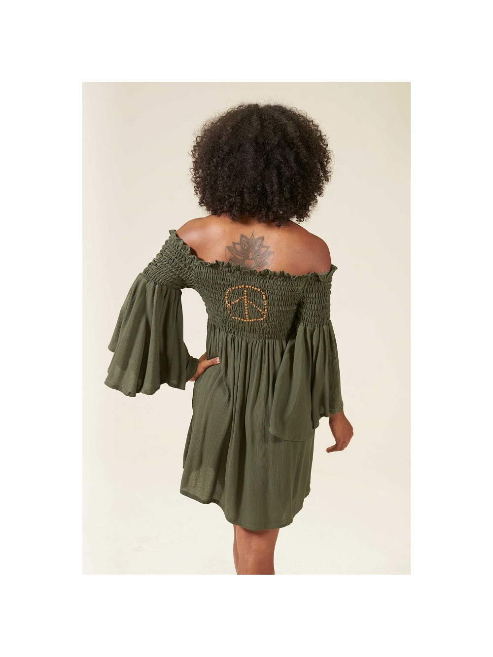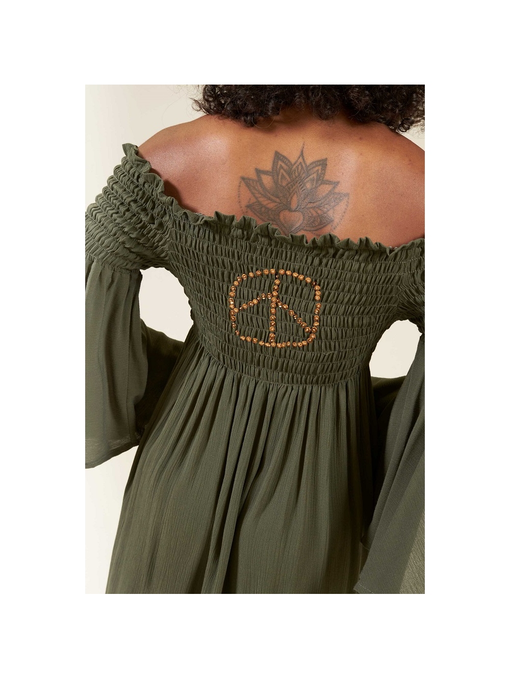 Las mangas largas con acabado acampanado añaden un toque de gracia y movimiento, creando un efecto encantador al caminar. Combínalo con unas sandalias romanas para un look bohemio y desenfadado. Además, el tejido está teñido de forma artesanal con técnicas tradicionales y pigmentos naturales, lo que le confiere un carácter único y artesanal. COMPOSICIÓN: