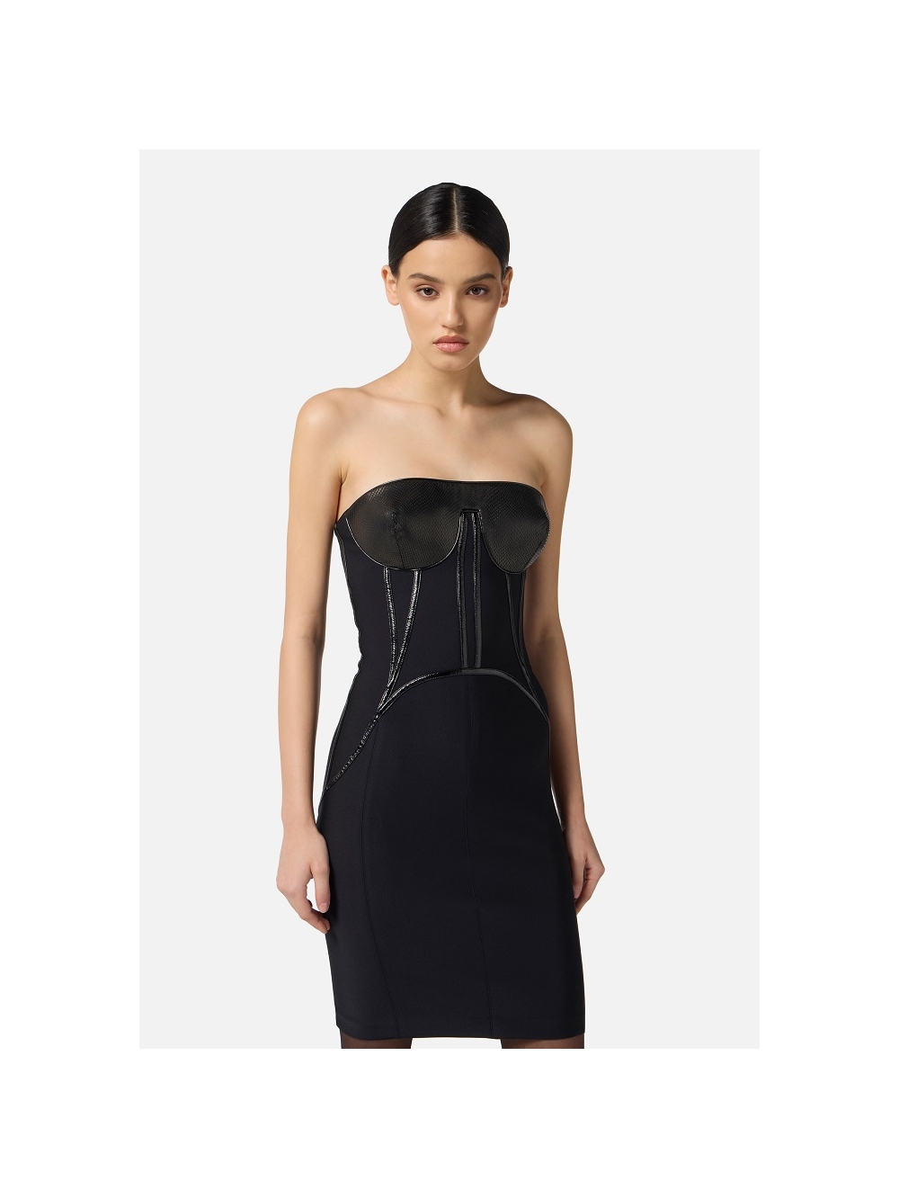 Vestido de neopreno de talla adherente. Vestido sin mangas caracterizado por las copas de tejido gamuzado con textura efecto pitón. Los detalles de vinilo perfilan la figura con una sensual confección tipo corsé. Detalles de vinilo. Cremallera en la parte trasera. Largo de 90 cm para la talla 40 IT. La modelo mide 177 cm y lleva una talla 40 IT COMPOSICIÓN: