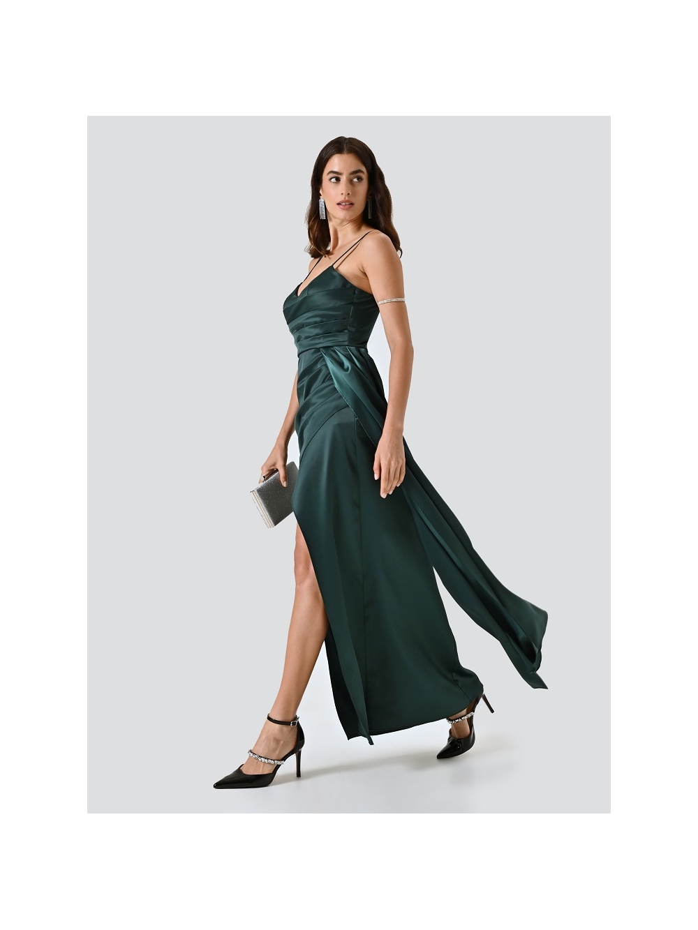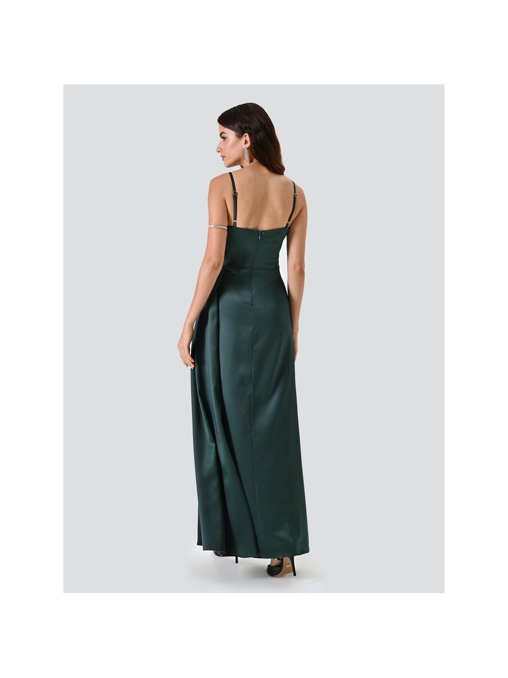 Este vestido largo verde es un modelo elegante y femenino, concebido para realzar tu figura con sofisticación y estilo. Su confección en satén de acabado luminoso presenta un cuerpo drapeado con copas preformadas, una estructura cruzada con drapeado que aporta movimiento y un diseño fluido. Además de los tirantes finos y regulables para mayor confort y un fit a medida, el cierre de cremallera en la espalda mantiene la nitidez y delicadeza de la pieza. ¡Esta será tu mejor opción si buscas un look romántico y sofisticado para una ceremonia! Todo el proceso de confección de la prenda se ha llevado a cabo en Italia. • La modelo mide 1,76 m y lleva una talla S. COMPOSICIÓN: