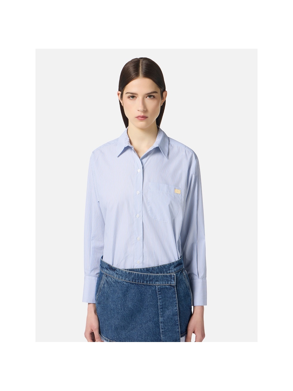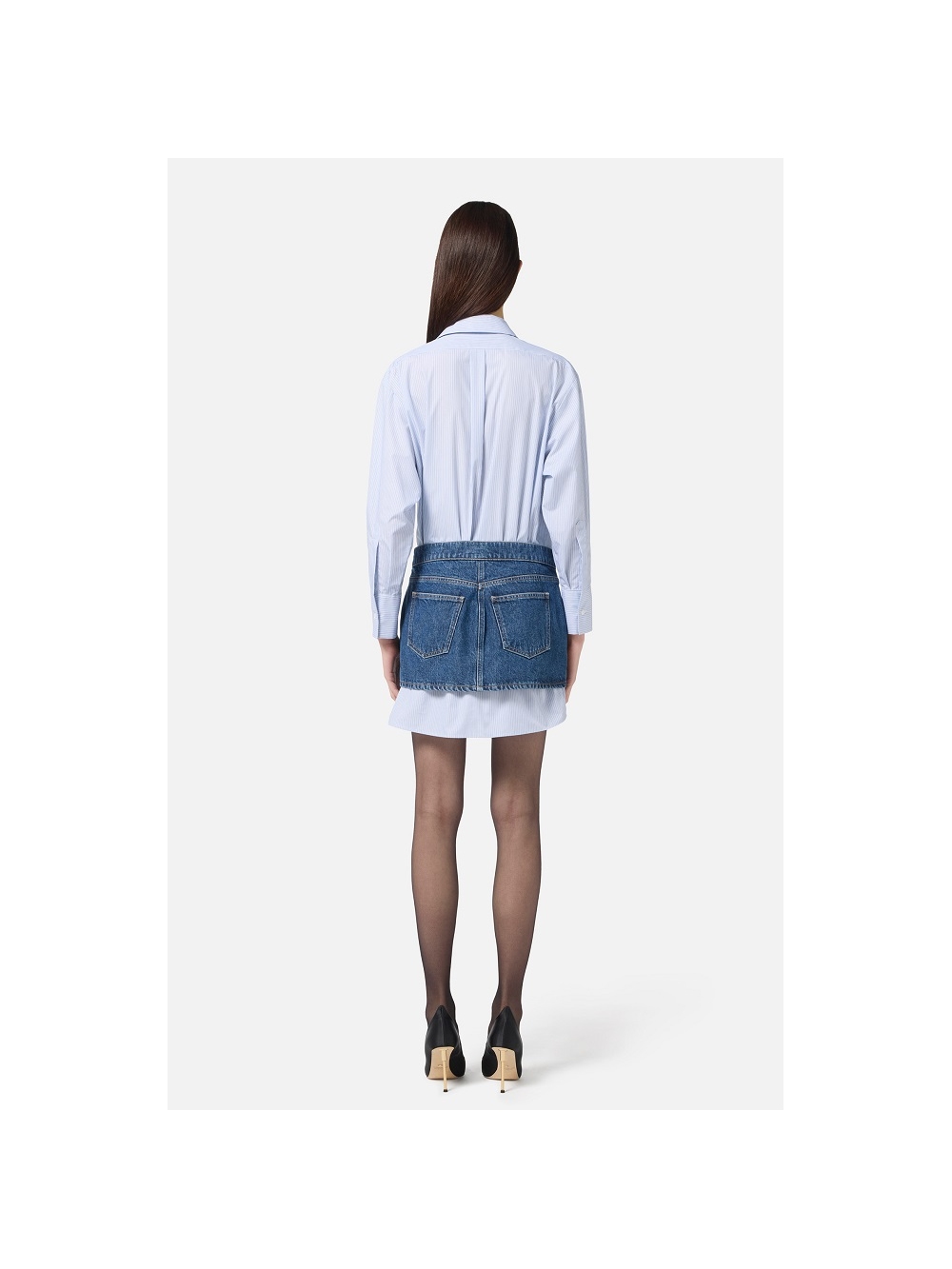 Vestido compuesto por camisa de popelina de algodón de rayas y minifalda de denim. La camisa tiene cuello clásico, mangas largas, bolsillo con placa de metal dorado, mientras que la minifalda presenta un cierre cruzado. Una dinámica combinación de texturas y superposiciones. Talla regular.