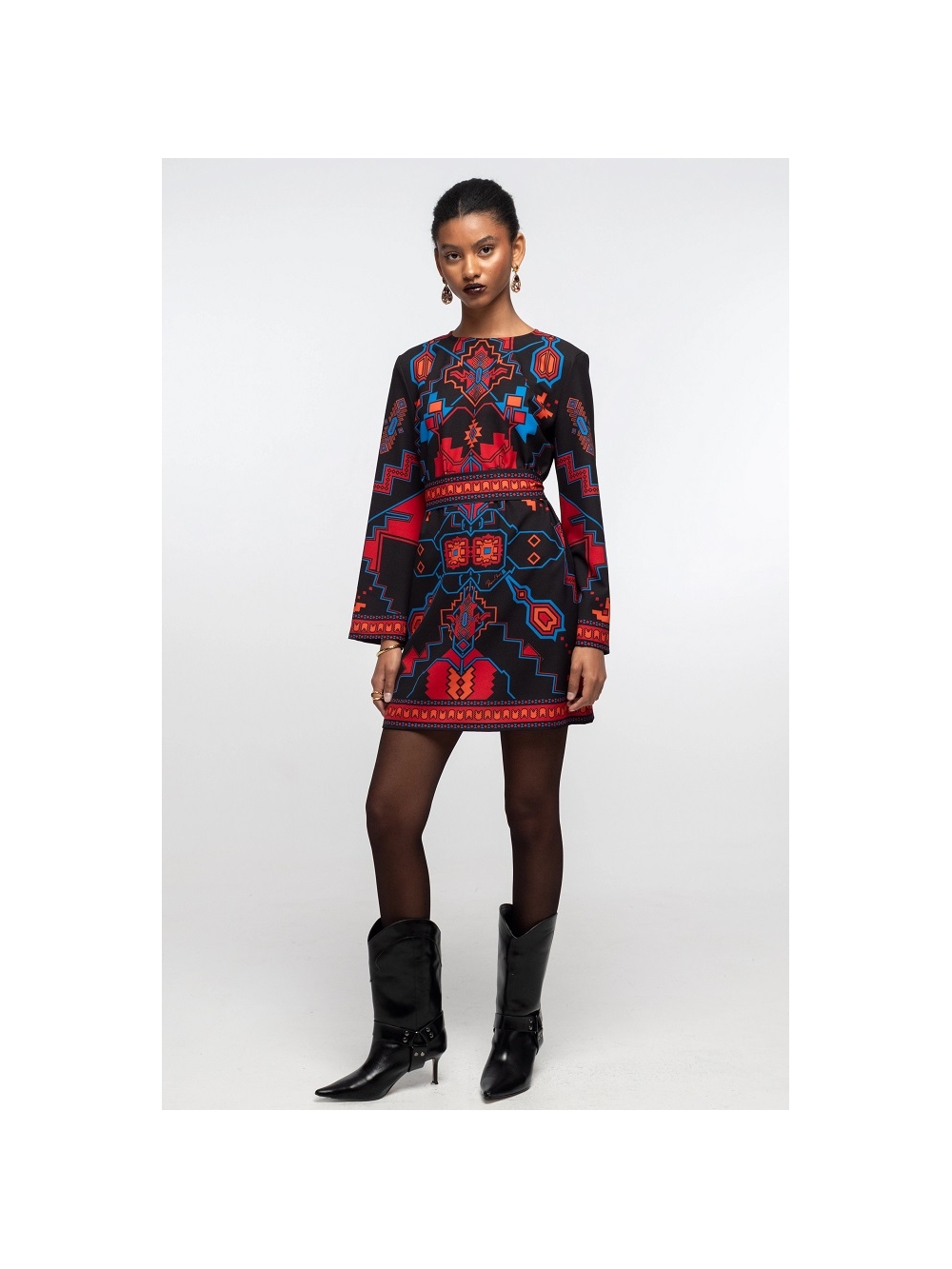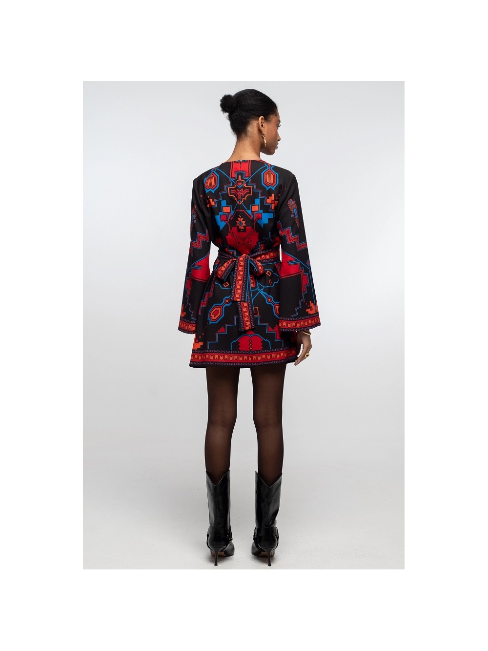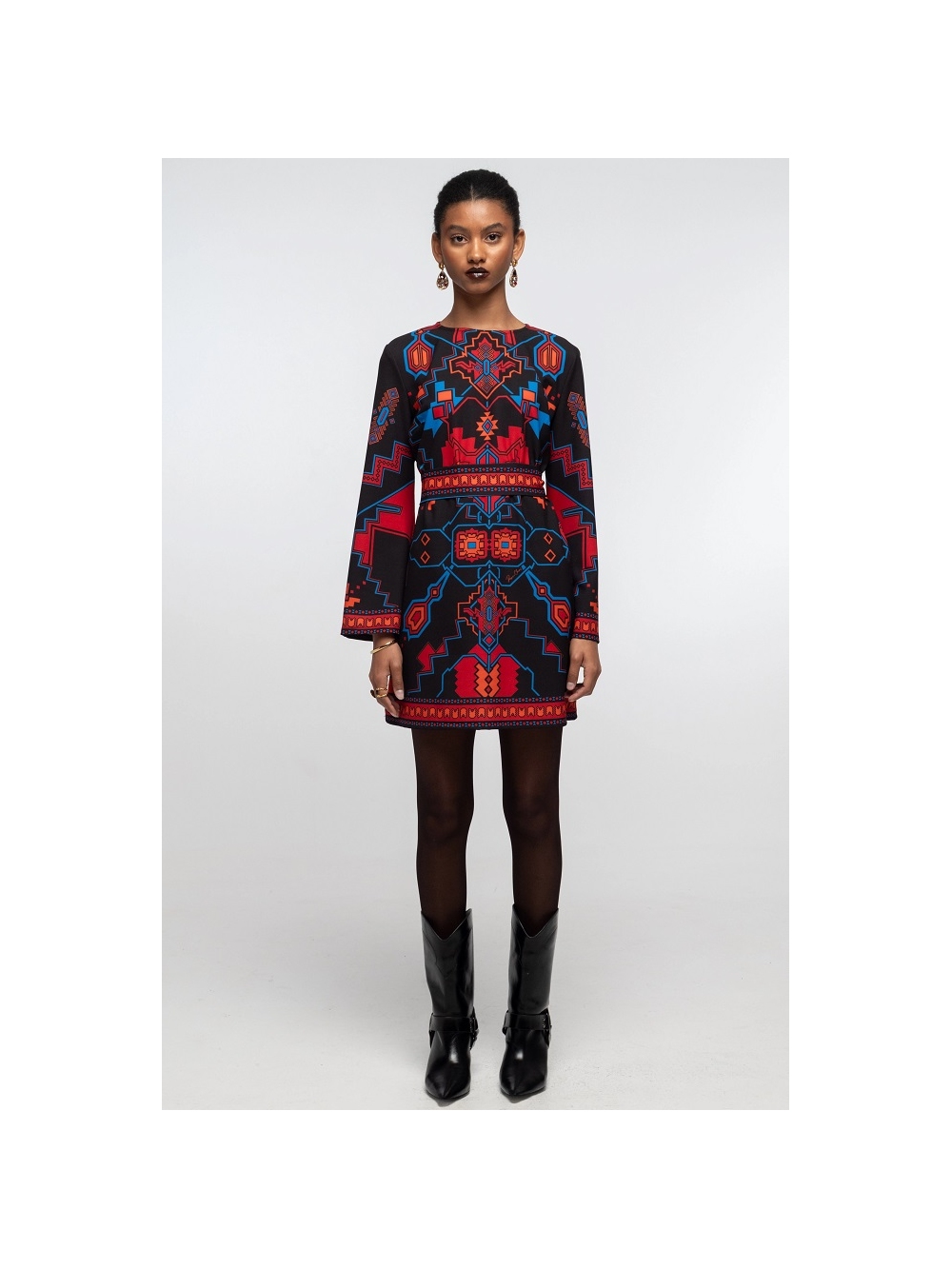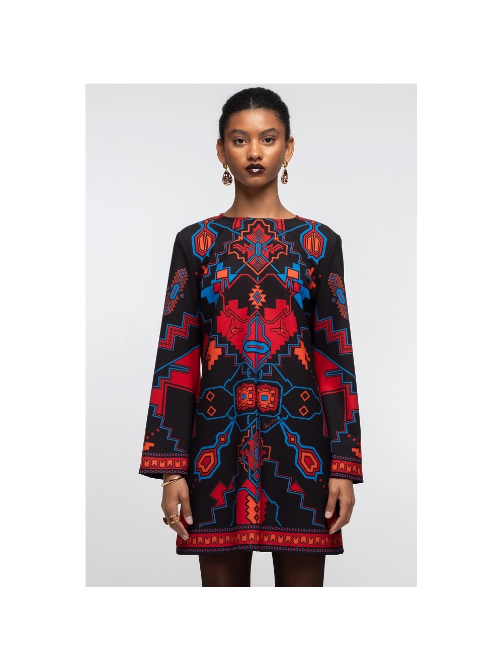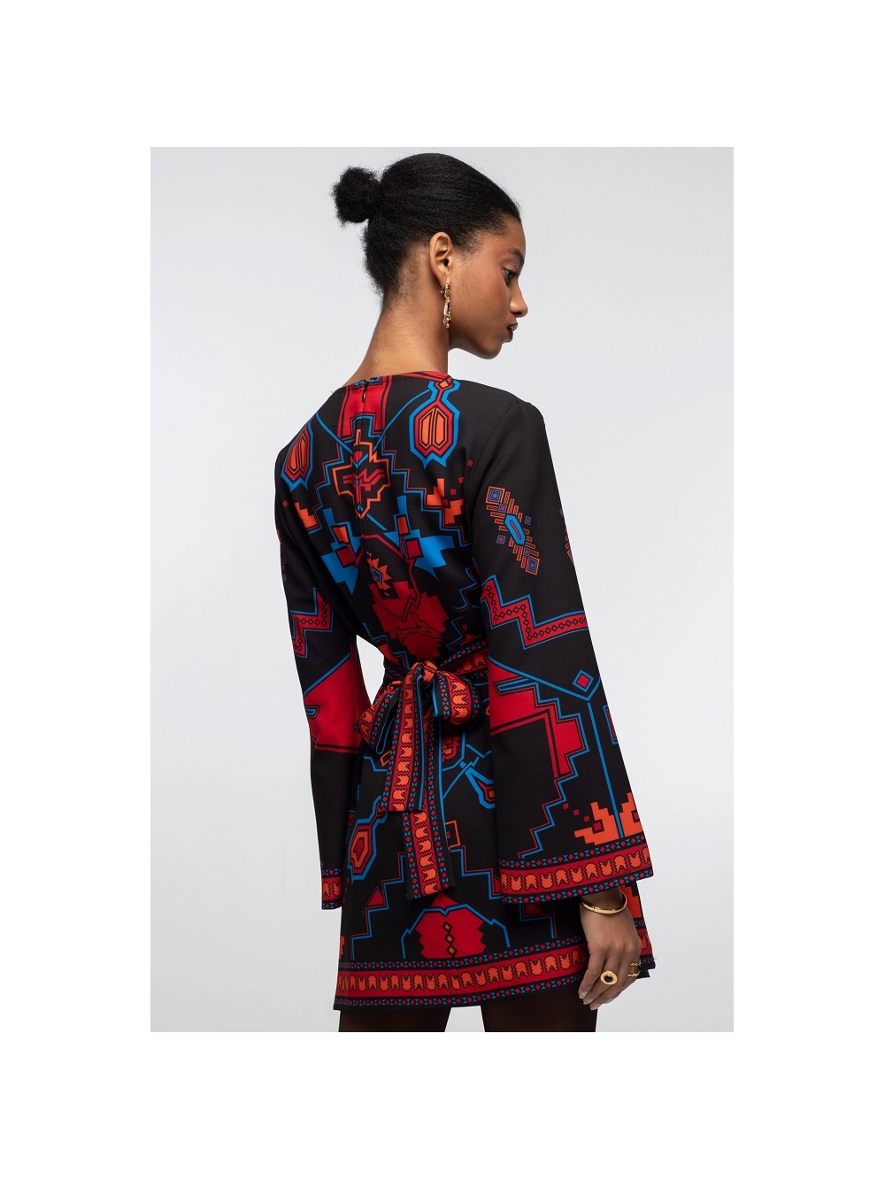 Vestido Corto Chronicle luce un estampado de crepé con un poderoso simbolismo y colores vibrantes. Con mangas largas acampanadas, este minivestido evasé se puede llevar con o sin cinturón a juego, mientras que la cremallera trasera invisible le proporciona un ajuste perfecto. Una opción divertida y coqueta para lucir como vestido de fiesta. Descubre el excepcional estampado de esta prenda, confeccionada con la técnica de la colocación. Cada pieza de la prenda presenta un estampado único que, al combinarse, crea una auténtica obra maestra. Cierre de cremallera invisible. Cinturón a juego. Diseñadores griegos COMPOSICIÓN: