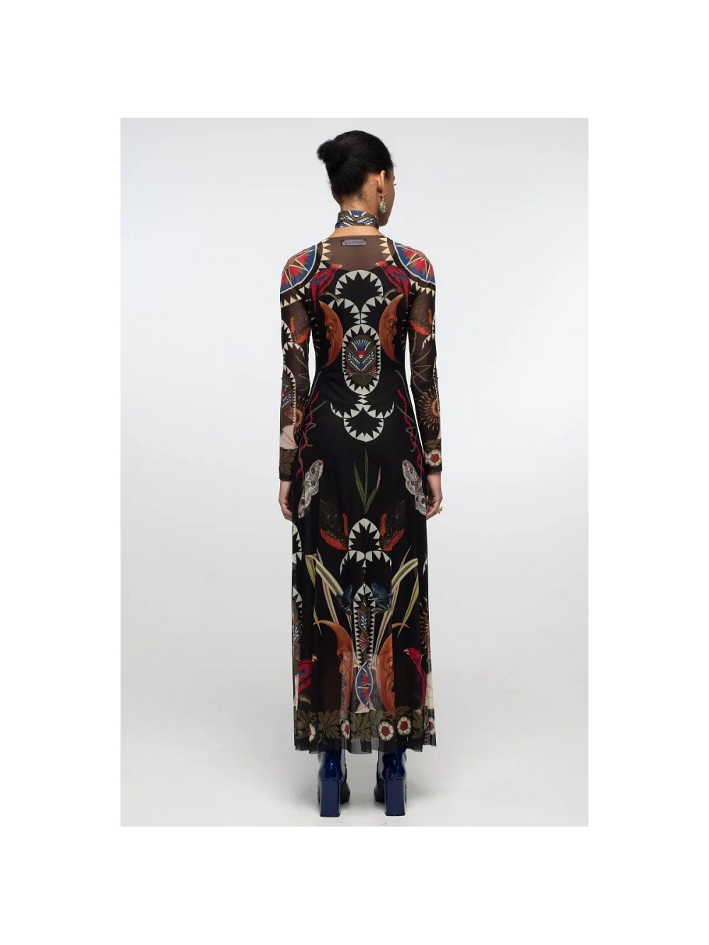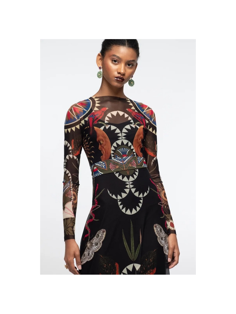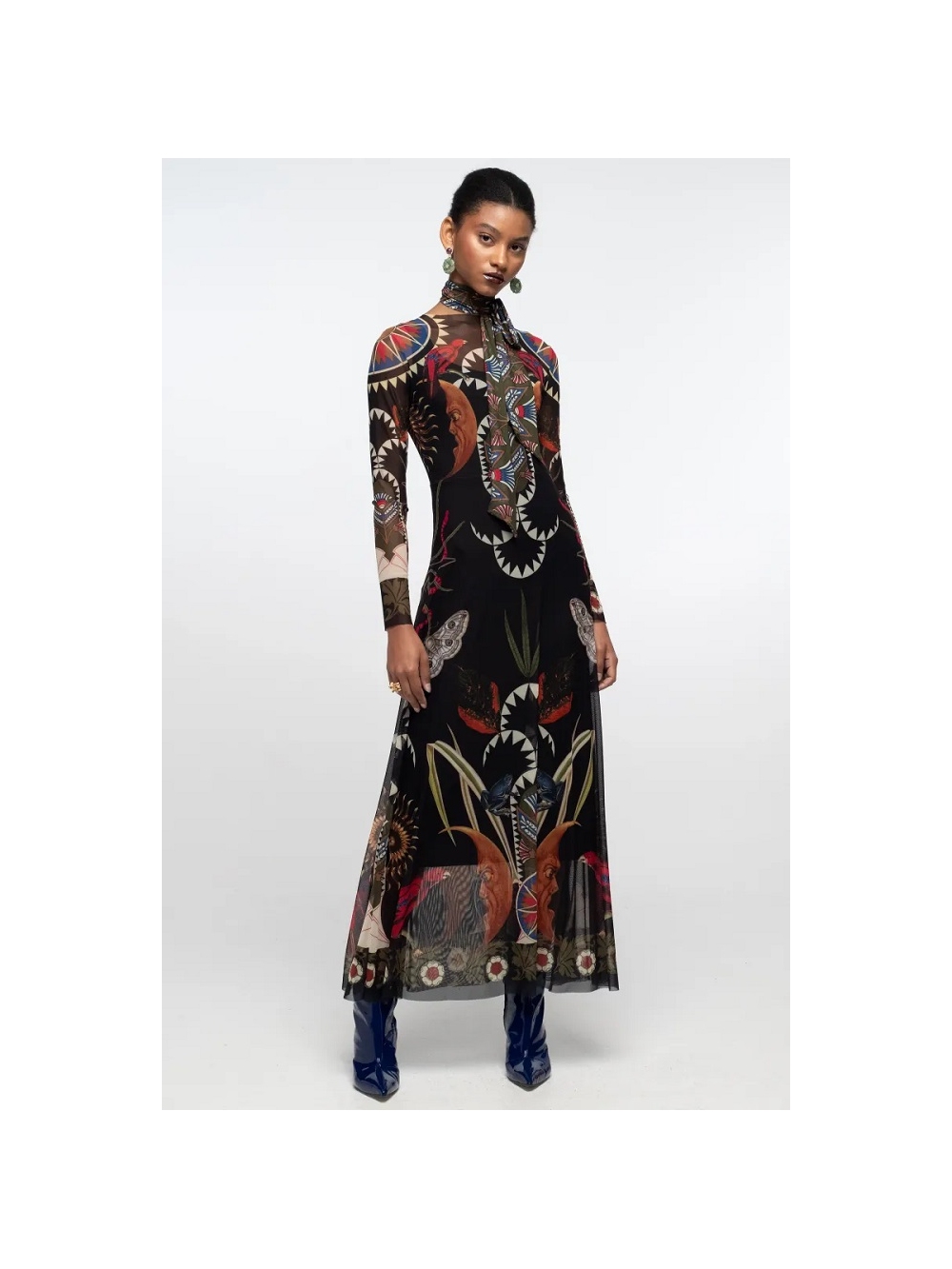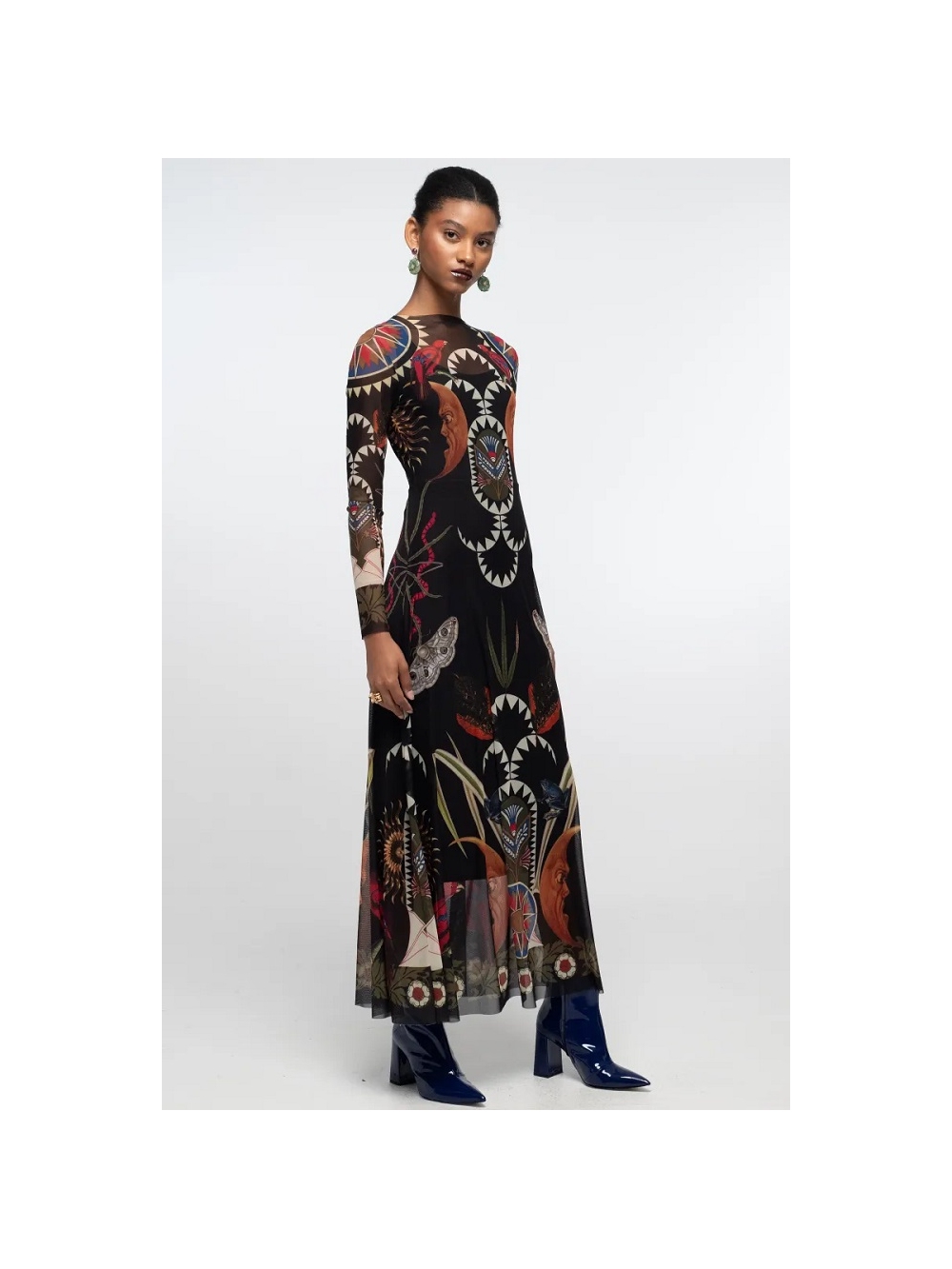 Nuestro Vestido Largo Nocturno captura el lado misterioso de la expresión femenina. Botánicos y simbolismo celestial se extienden sobre una malla elástica translúcida negra en una combinación de tonos joya polvorientos y dorados envejecidos. Con mangas largas y corte en A, este vestido de malla suave cae con gracia sobre un vestido lencero negro opaco de largo midi. Su cinturón a juego se puede usar como pañuelo de cinta anudado al cuello para un toque adicional. COMPOSICIÓN: