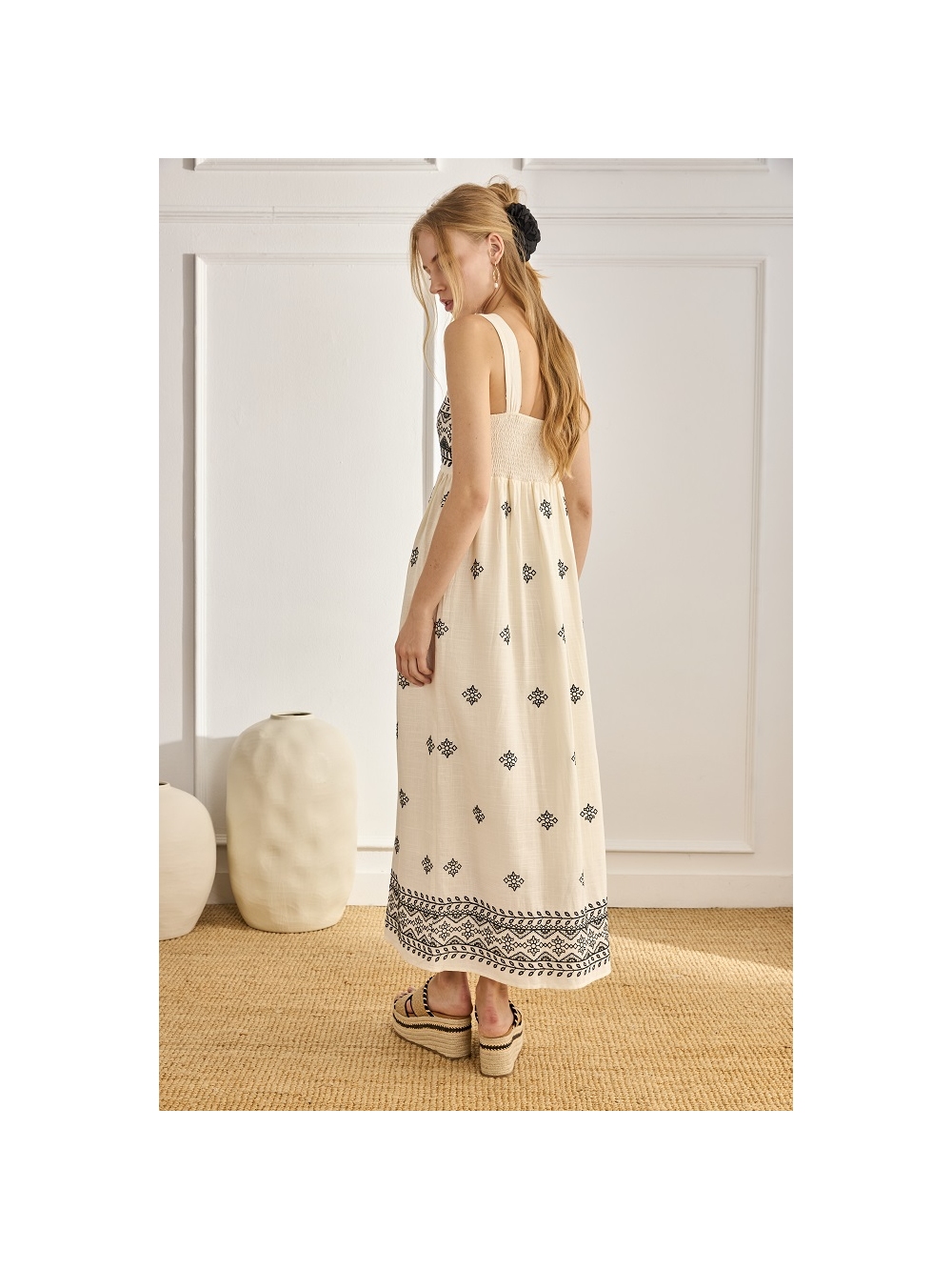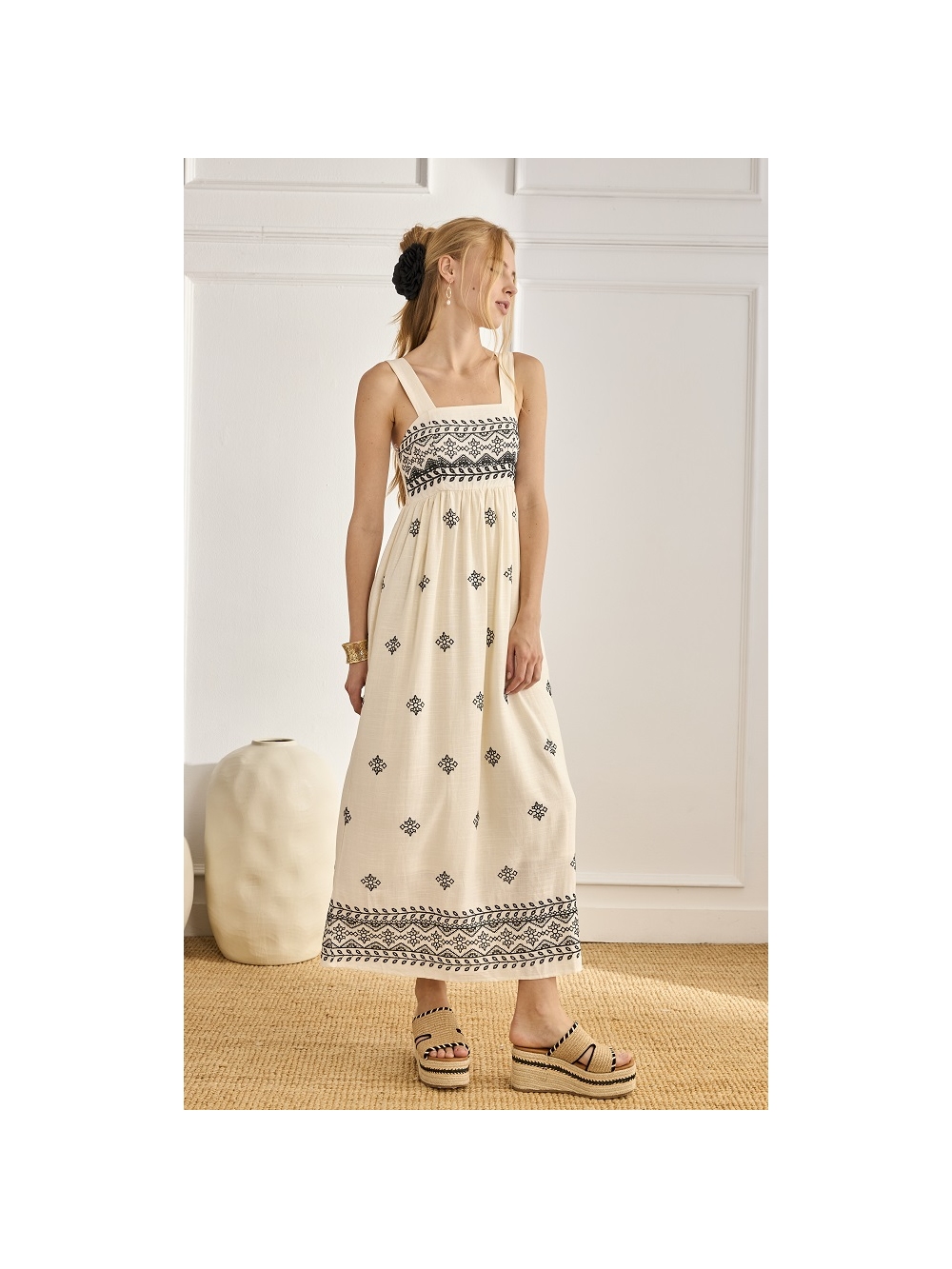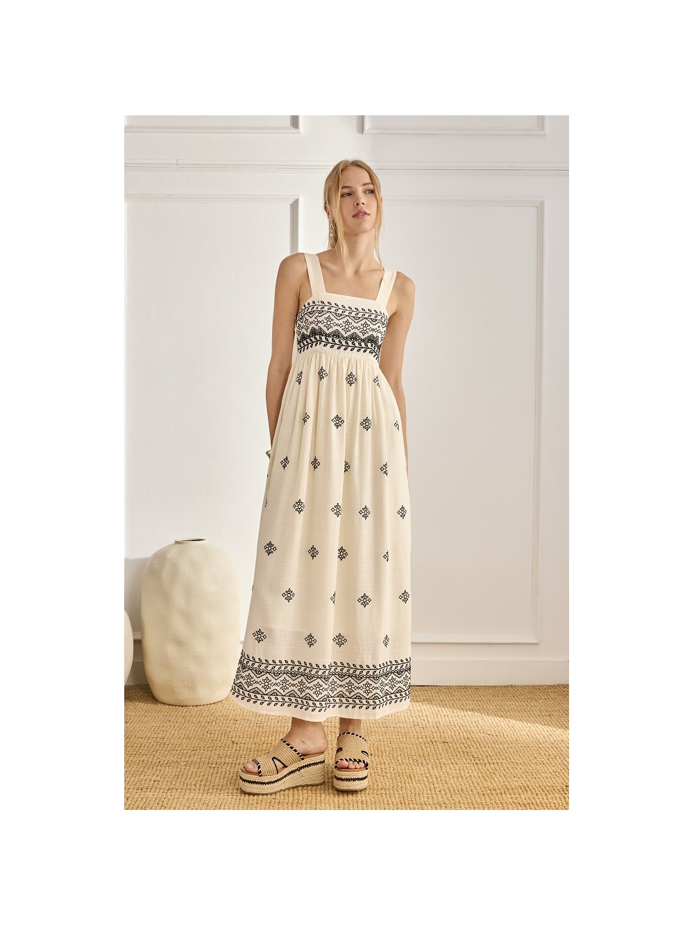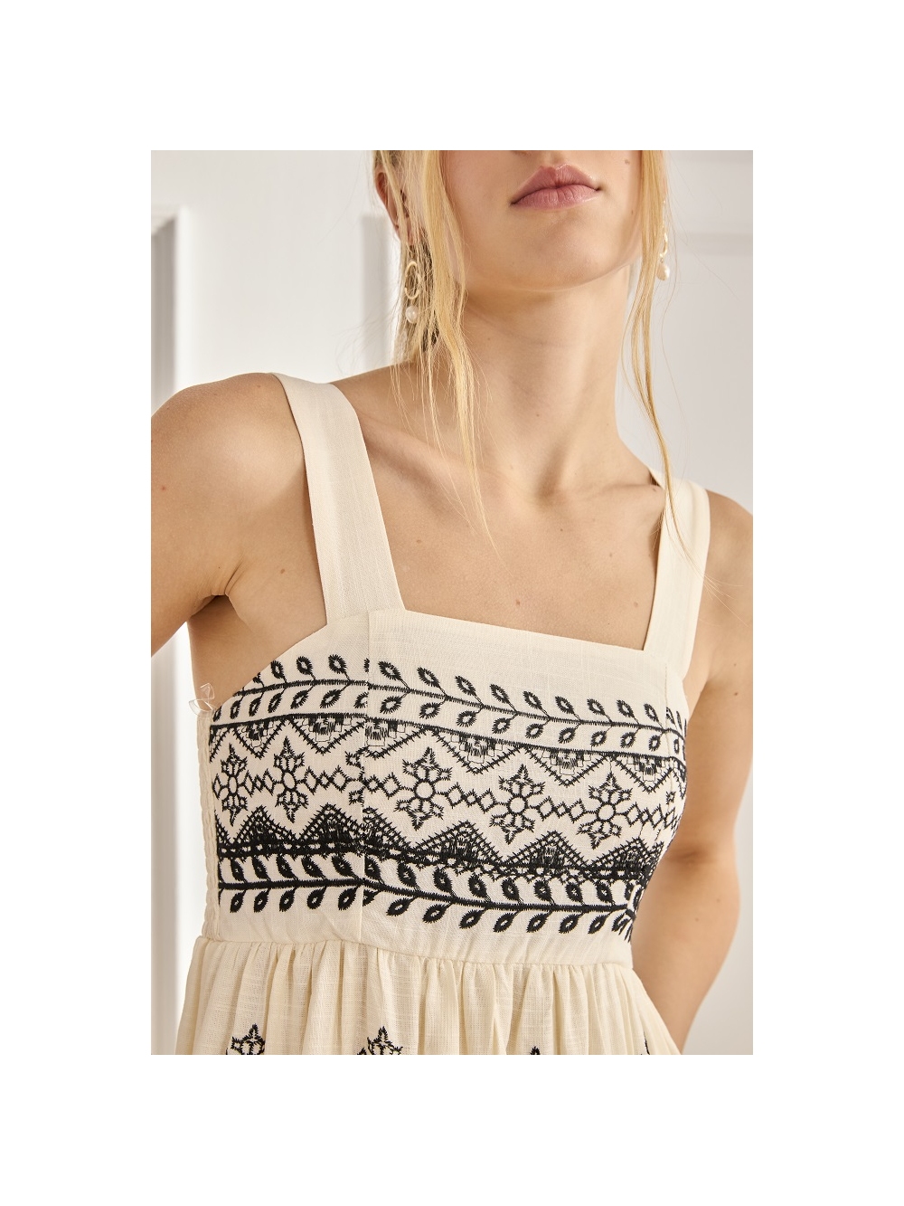 VESTIDO LARGO LINO BORDADO Y ESC. CUADRA