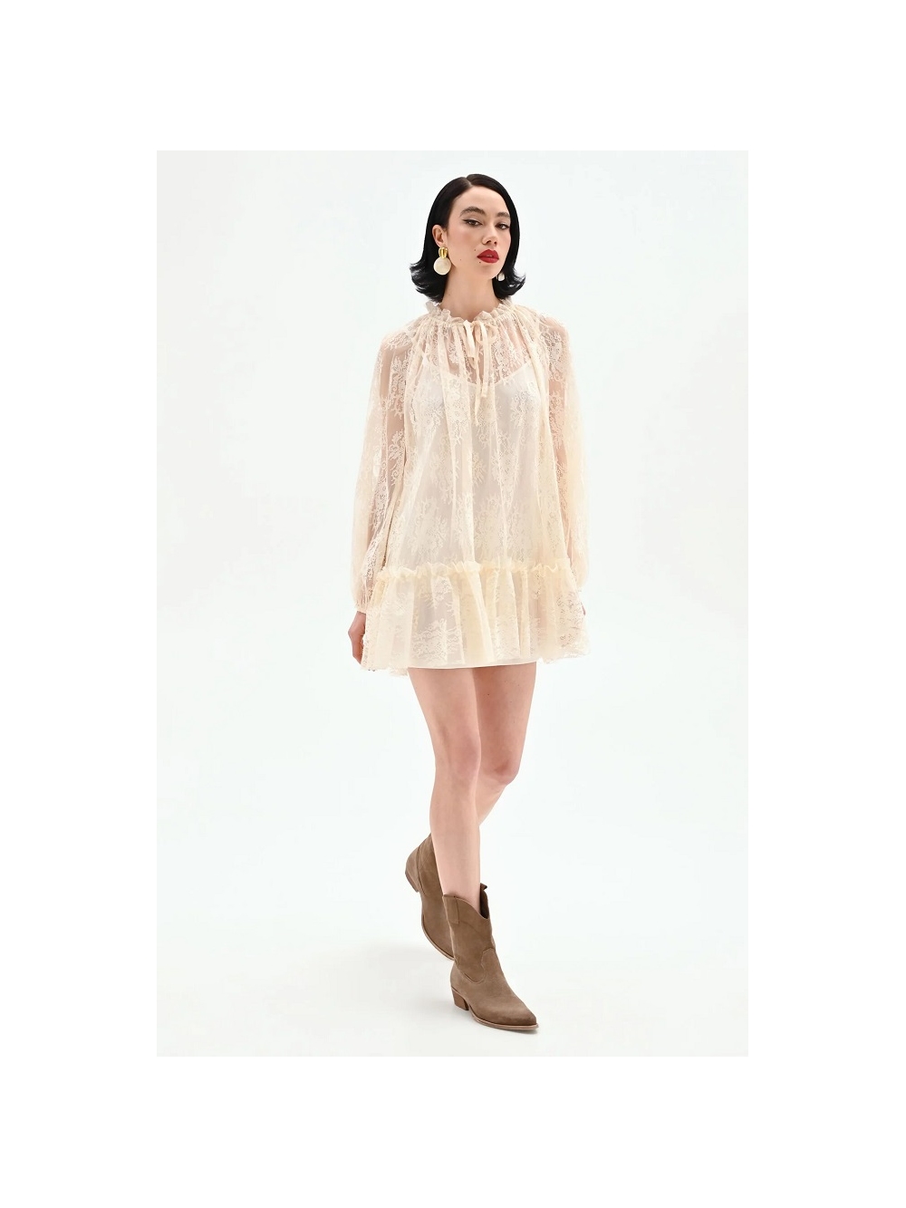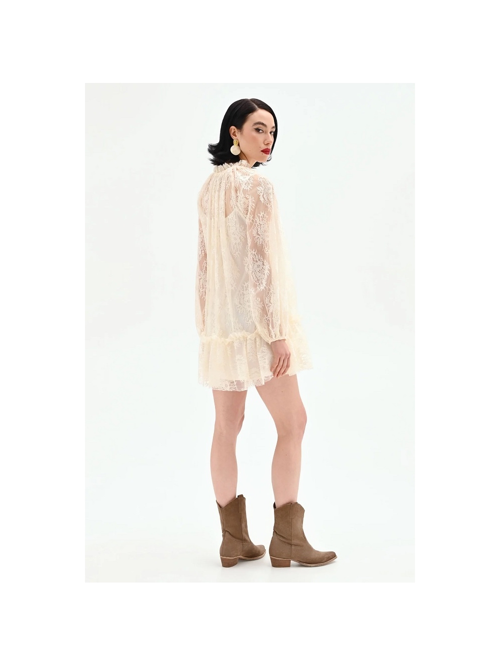 La ligereza del encaje se une a un diseño desenfadado y romántico en el minivestido color nata. una prenda pensada para quienes aman expresar su feminidad con un estilo versátil. Confeccionado íntegramente en encaje con un delicado motivo floral. este vestido se distingue por su línea fluida y vaporosa. El cuello redondo. alto y fruncido. está adornado con finos cordones tono sobre tono para anudar en un lazo. un detalle que añade un toque sofisticado al diseño. Las mangas largas y amplias juegan con un elegante efecto de transparencia. equilibrado por el forro interior que garantiza la cobertura adecuada. La silueta se completa con un volante fruncido en el bajo que aporta movimiento y volumen a la falda corta. El cierre en la espalda garantiza un ajuste perfecto. Ideal para ocasiones informales. desde el aperitivo hasta el tiempo libre. este vestido revela su alma contemporánea combinado con una chaqueta y botas tejanas. creando un look con carácter y de tendencia. fácil de adaptar a cualquier momento del día. Prenda confeccionada en Italia. La modelo mide 1.75 m y lleva la talla S. COMPOSICIÓN: